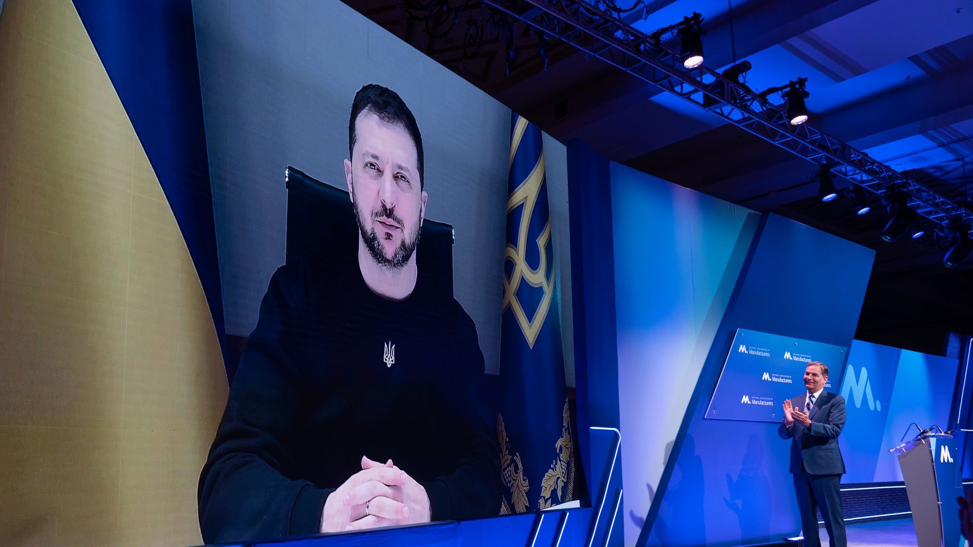Ukraine President Volodymyr Zelensky addresses the National Association of Manufacturers board. Photo: David Bohrer, NAM