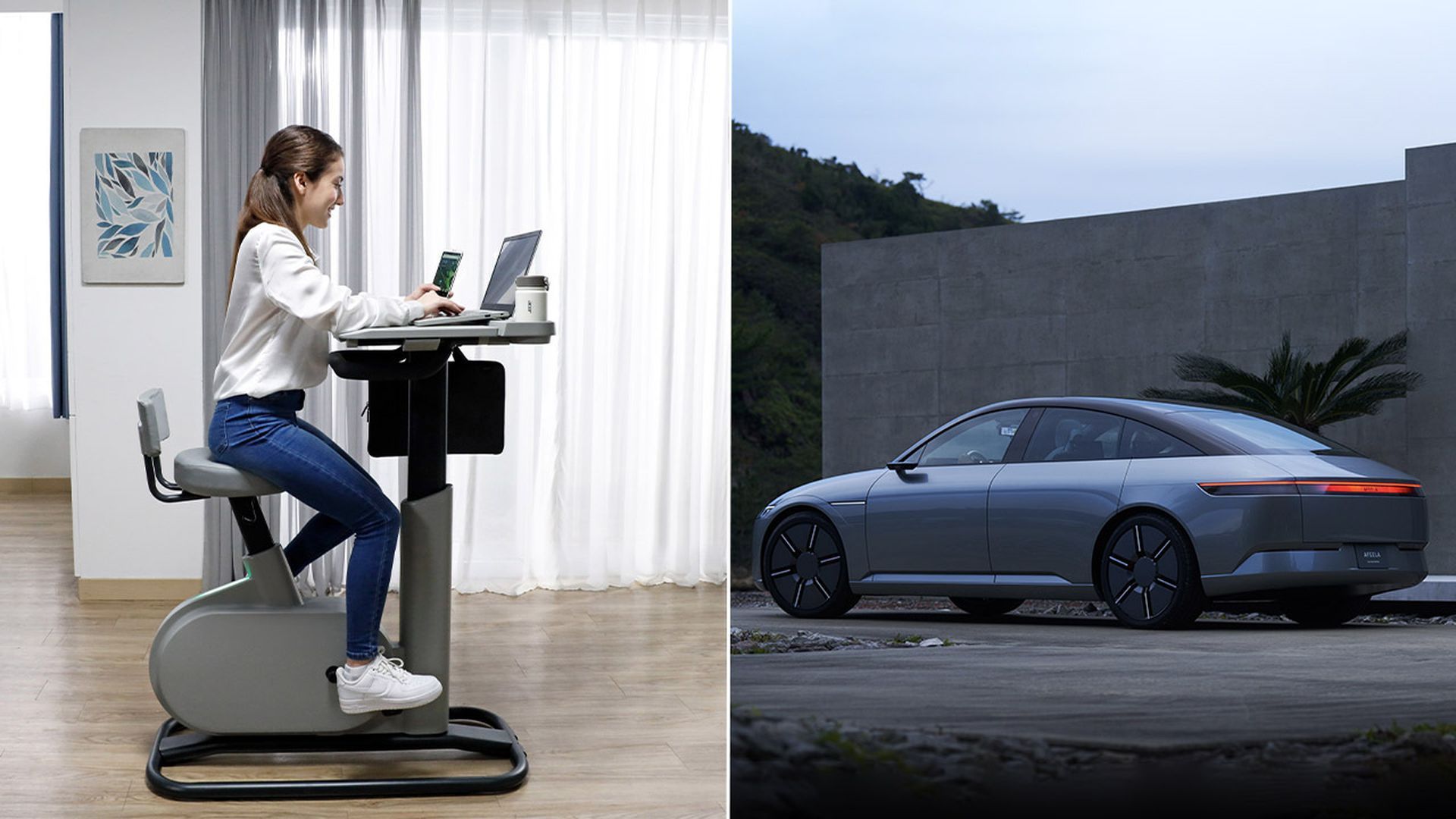 The Acer's eKinekt BD 3 bike desk and an AFEELA EV prototype developed by Sony and Honda. Photo (left): Acer. Photo (right): Sony Honda Mobility.