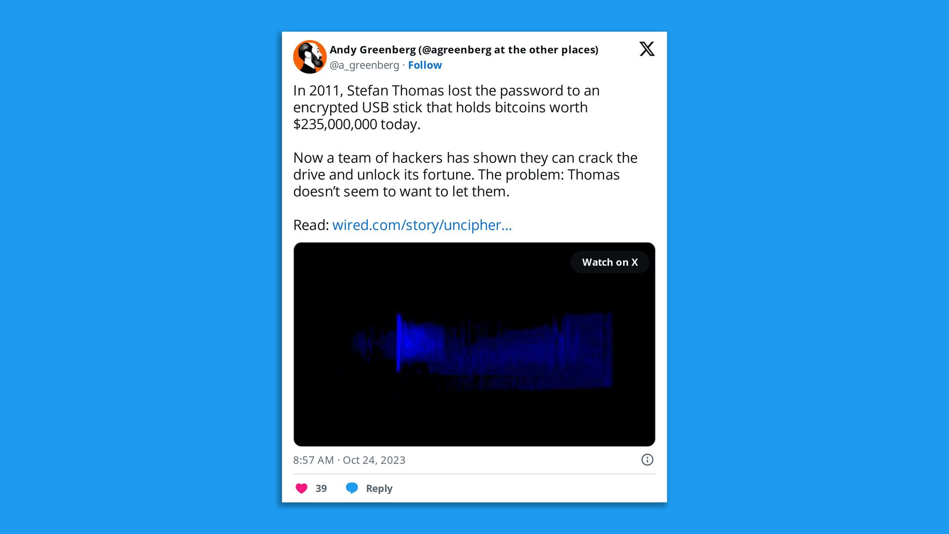 Brb, I'm being sucked into this Wired story depicting a startup's quest to unlock an encrypted USB that's storing close to $235 million worth of cryptocurrency. 💰🪙