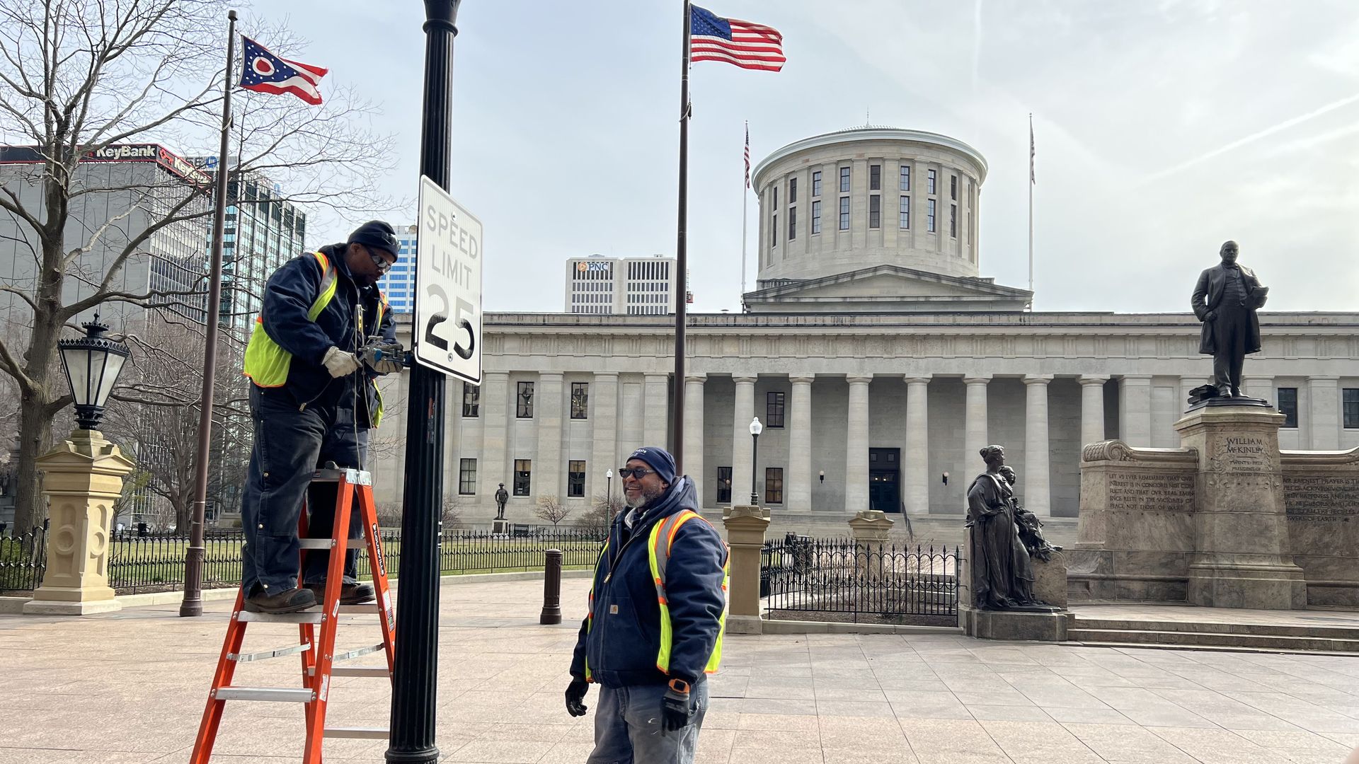 Columbus traffic employees Derrick Hodo (on ladder) and James Penn install a new speed limit sign in front of the Ohio Statehouse. Photo: Courtesy of the Columbus Department of Public Service