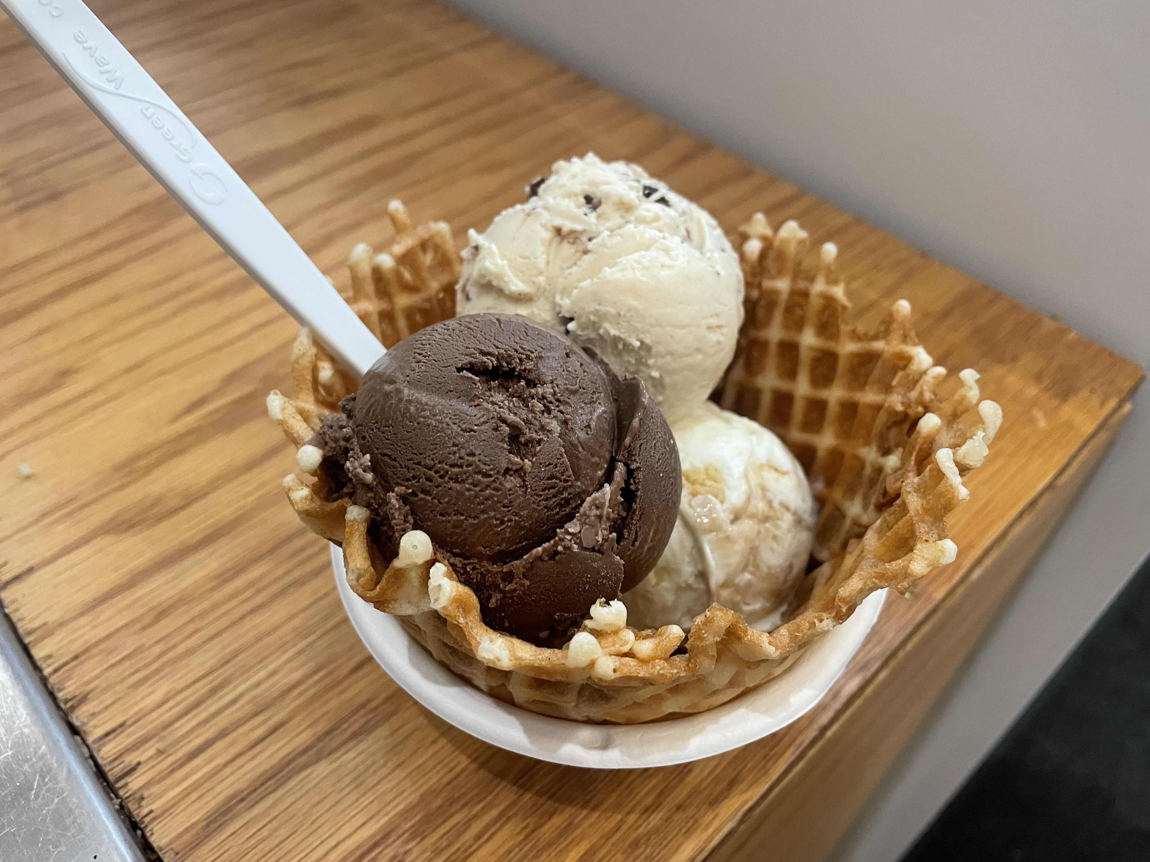 What I tried: The trio with three half scoops in a waffle bowl with Salted Peanut Butter with Chocolate Flecks, Gooey Butter Cake and Darkest Chocolate ($7, plus $1.50 for the bowl).