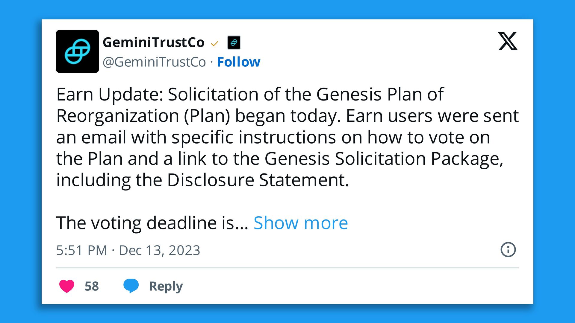 - "VOTE NO" — one person commented on Gemini's post, saying that 61% on the petition date amounts to roughly 31% based on BTC prices now.