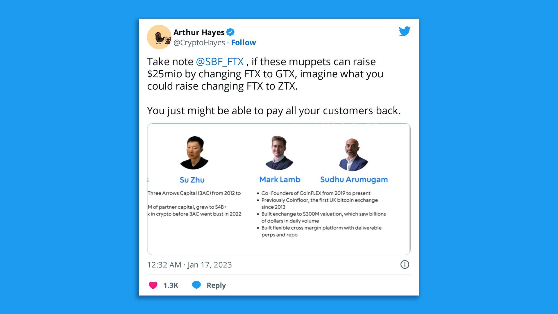 Driving the news: Su Zhu and Kyle Davies, co-founders of the now-collapsed Three Arrows Capital, alongside Mark Lamb, founder of crypto platform CoinFLEX (now in restructuring), are working on a new crypto exchange called GTX.