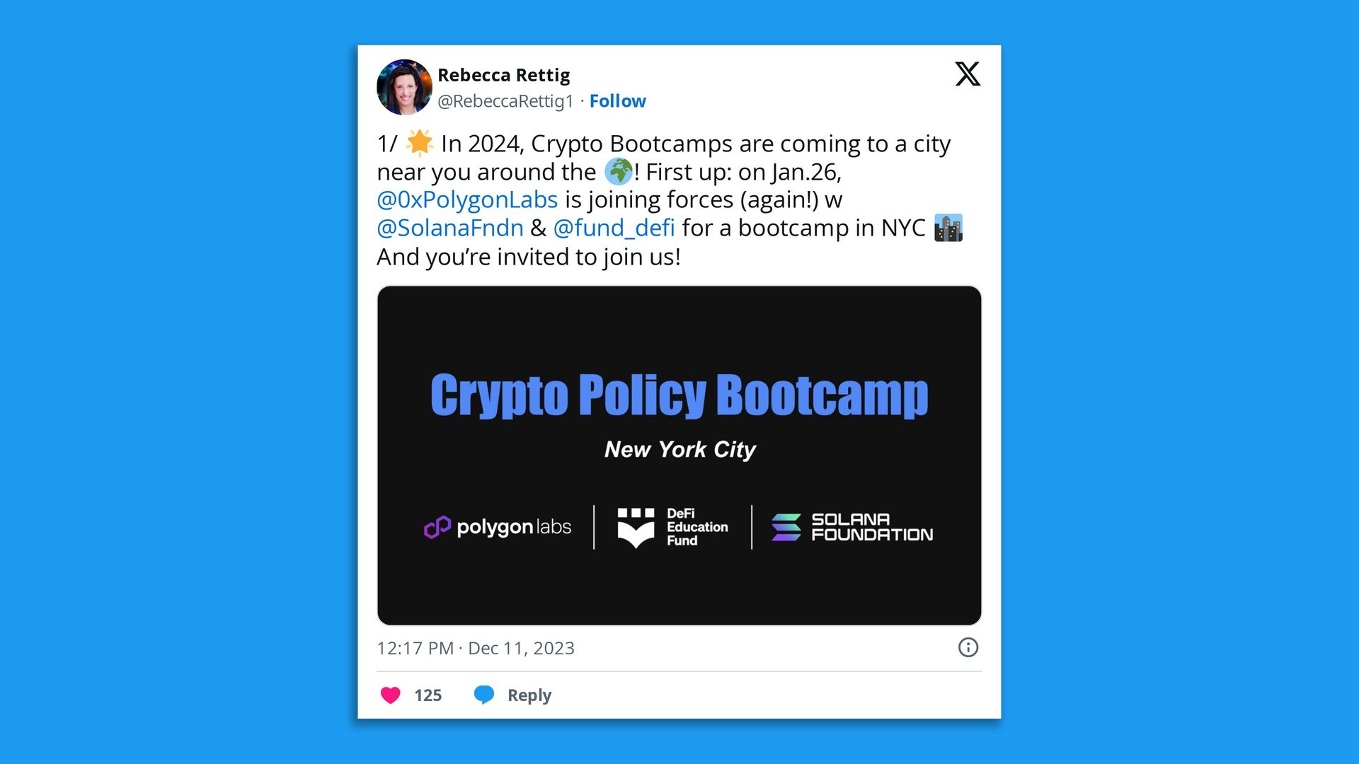 What's happening: Polygon Labs, the Defi Education Fund and the Solana Foundation are hosting a crypto policy bootcamp in NYC.