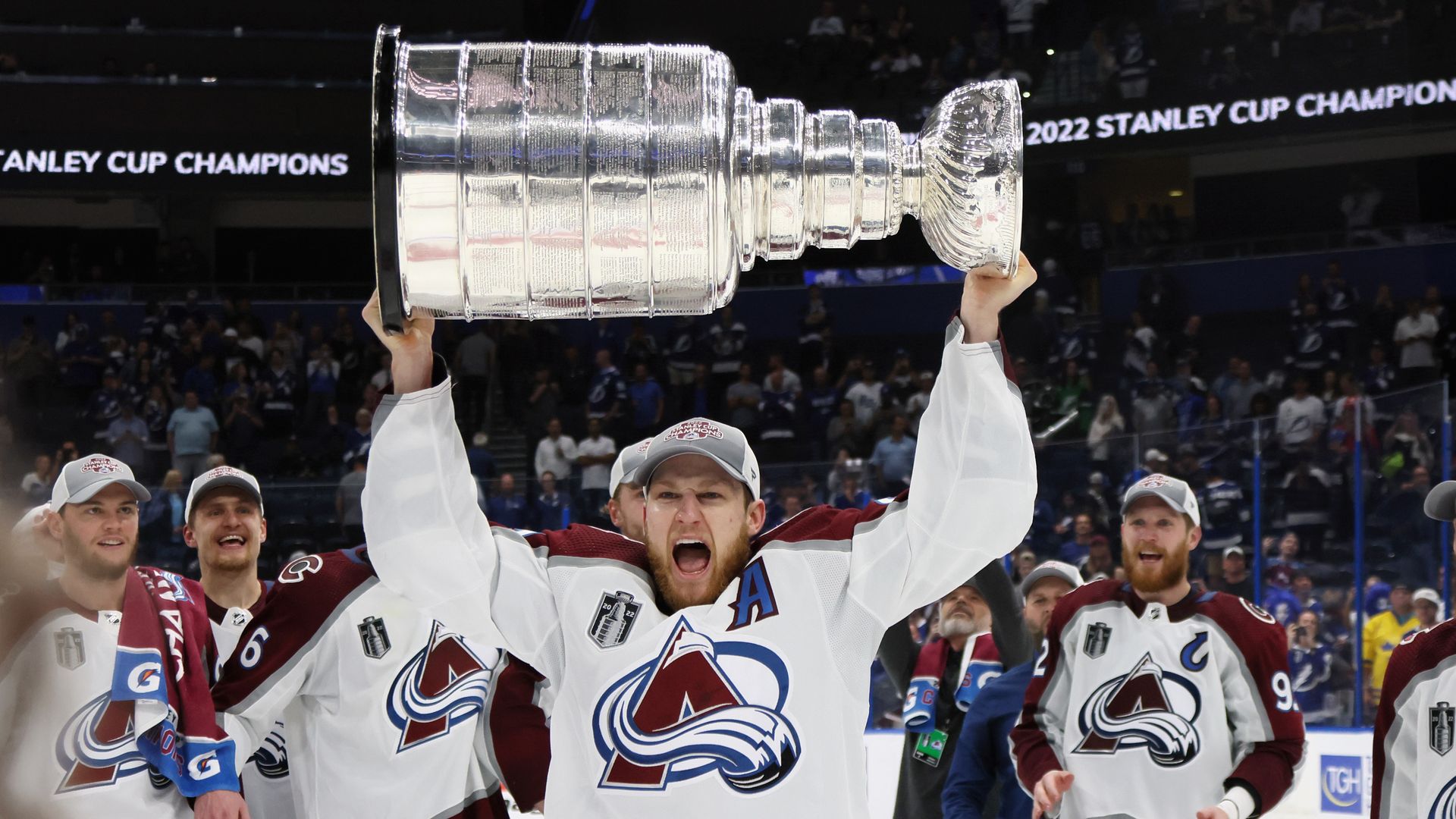 The Colorado Avalanche's Nathan MacKinnon carries the Stanley Cup after defeating the Tampa Bay Lightning in June. Photo: Bruce Bennett/Getty Images