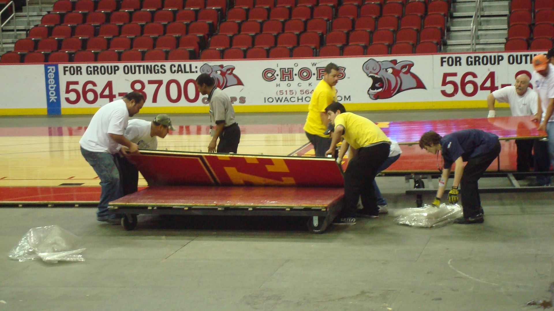 Catch up fast: The hardwood floor is like a puzzle that is taken apart and stored when the arena is used by the Iowa Wild ice hockey team or non-sports events like concerts.