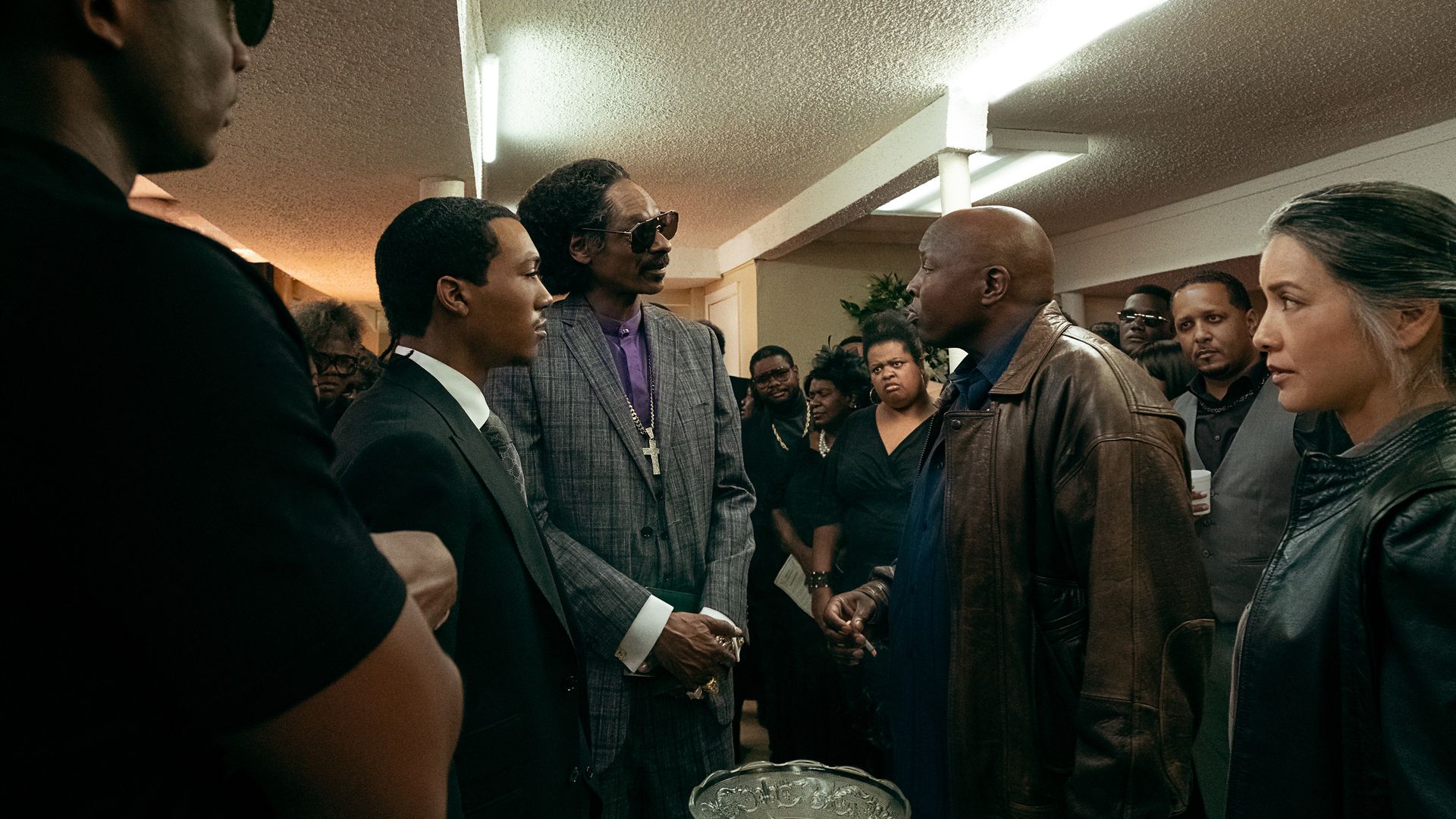 From left to right: Abraham 'Da'Vinchi' Juste ("Terry 'Southwest T' Flenory”), Demetrius 'Lil Meech' Flenory Jr. (“Demetrius 'Big Meech' Flenory”), Snoop Dogg (“Pastor Swift”), Steve Harris (“Detective Von Bryant”), Kelly Hu (“Detective Veronica Jin”). Photo: Courtesy of Starz