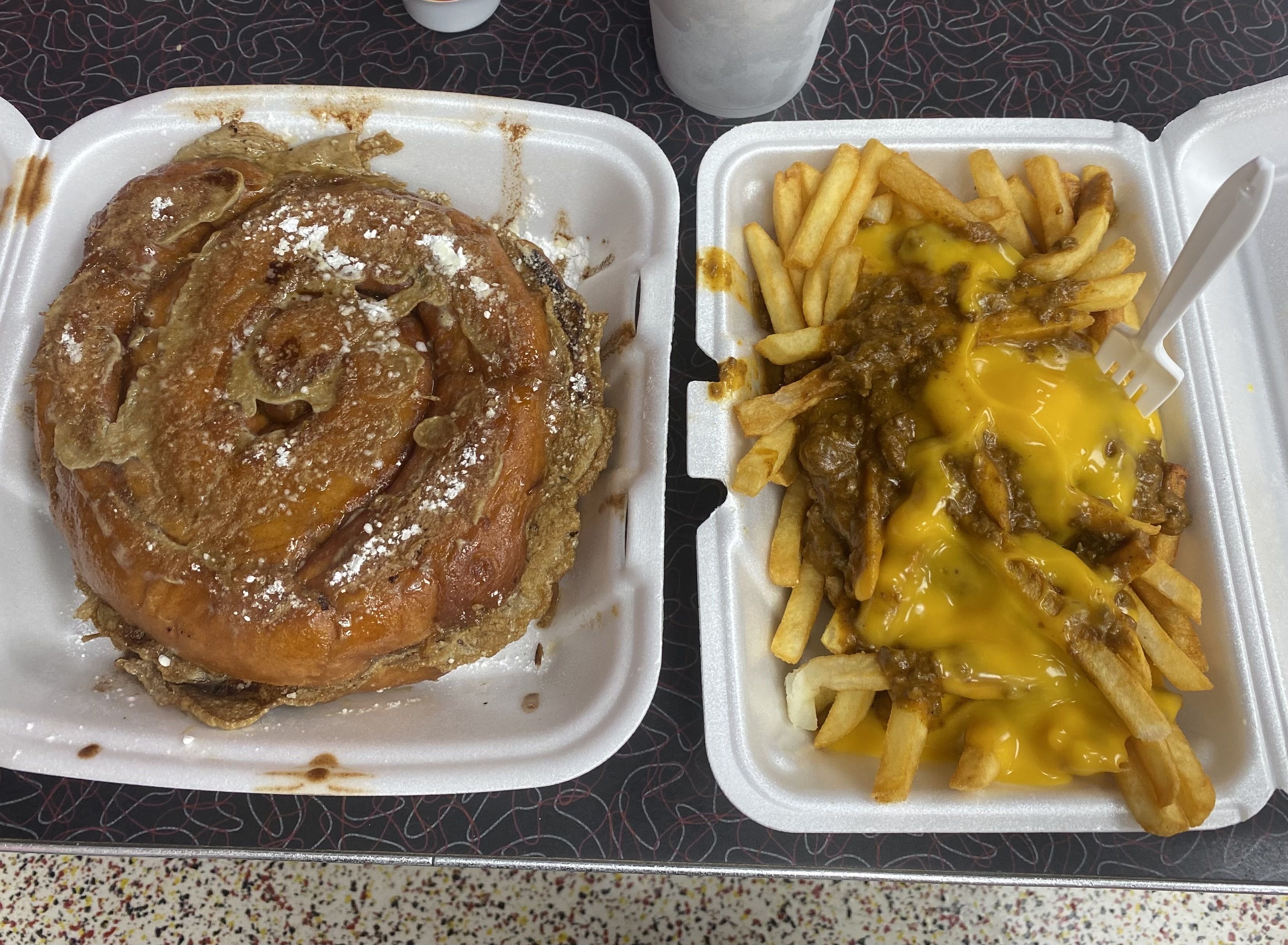 What we ate: On a recent nighttime visit, a friend chose chili cheese fries — they give you a lot, with a choice of cheddar or squeeze cheese — while my ever-present sweet tooth drove me to a monumental helping of cinnamon roll French toast.