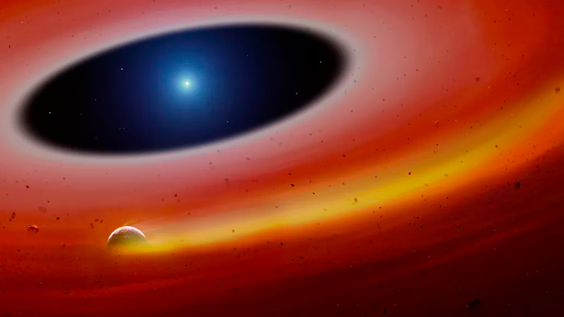 Artist's illustration of a planet disintegrating in orbit around a white dwarf star. Photo: University of Warwick/Mark Garlick