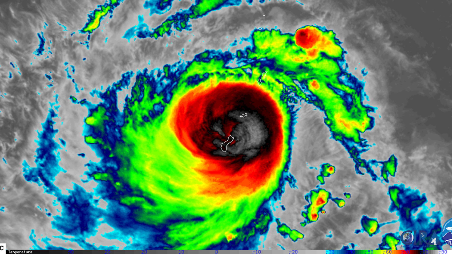Infrared satellite image of Typhoon Mawar hitting Guam on May 24. Image: CIRA/RAMMB