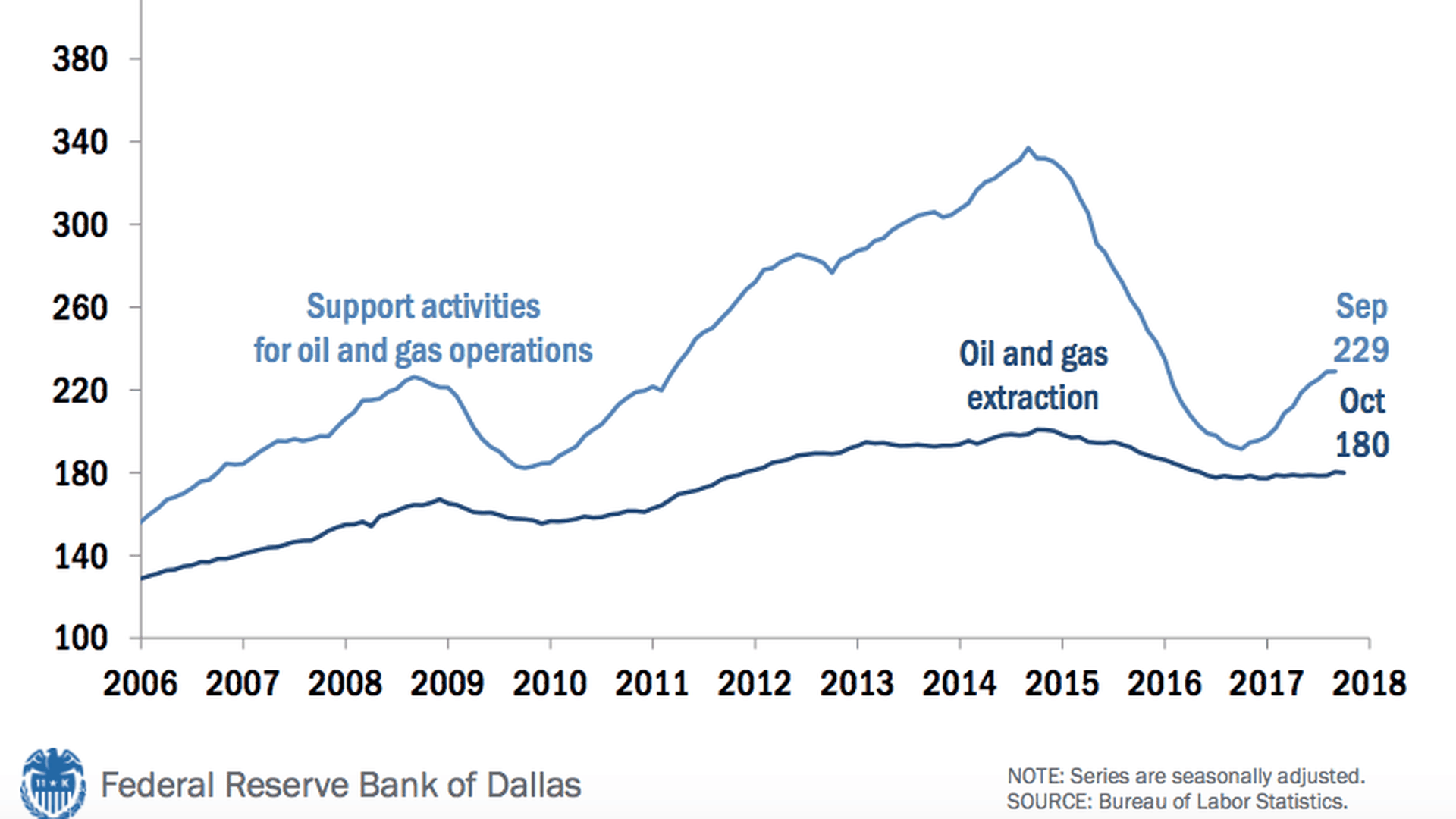 It shows how employment in one key part of the industry — extraction and supporting activities — has not bounced back alongside U.S. production, which fell sharply in 2015 after prices collapsed but has been moving up again for a year and heading for record levels.