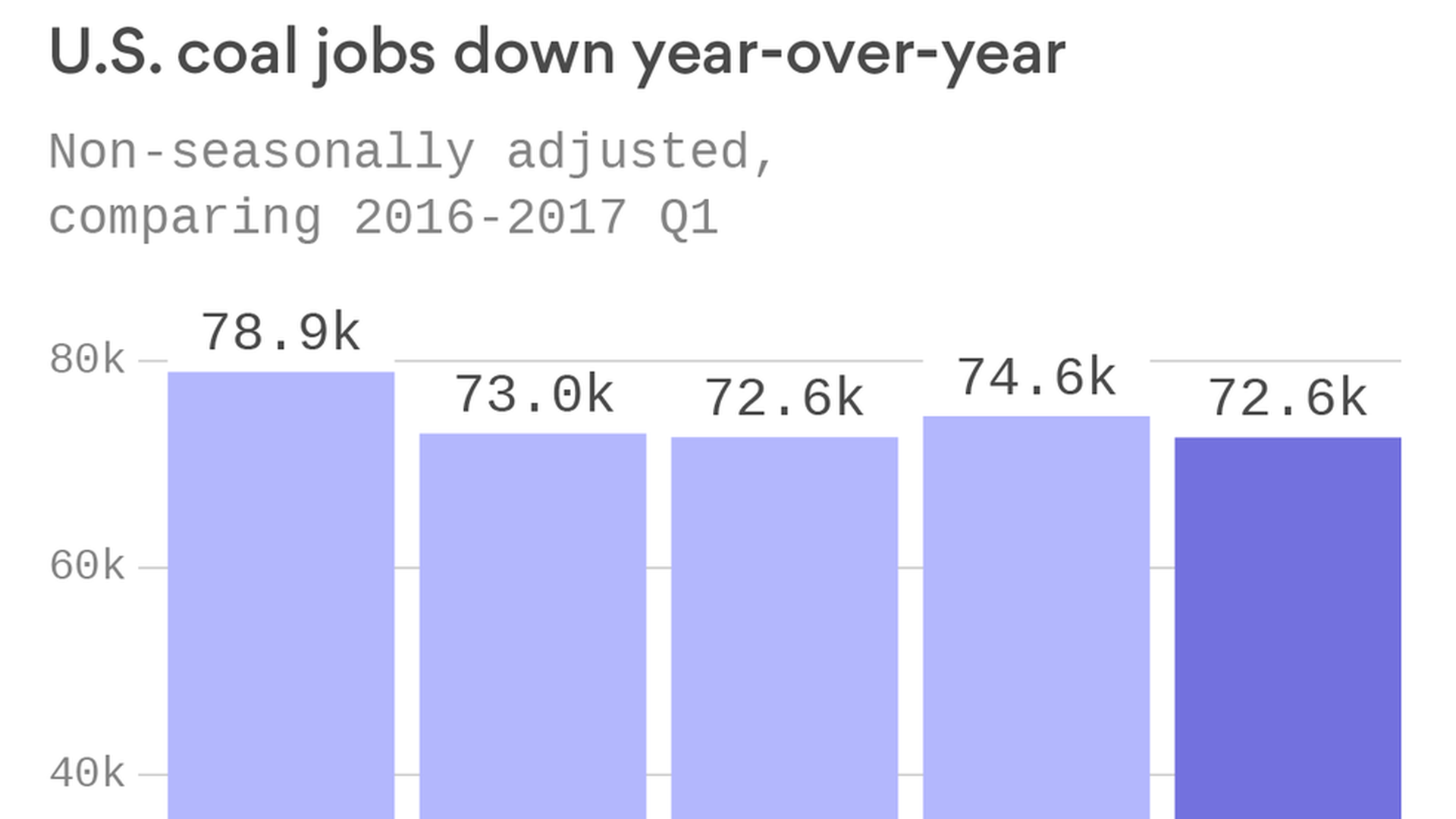 Coal mining jobs dropped almost 8% in the first quarter of 2017 compared with the same period last year, according to Labor Department data obtained by Axios.