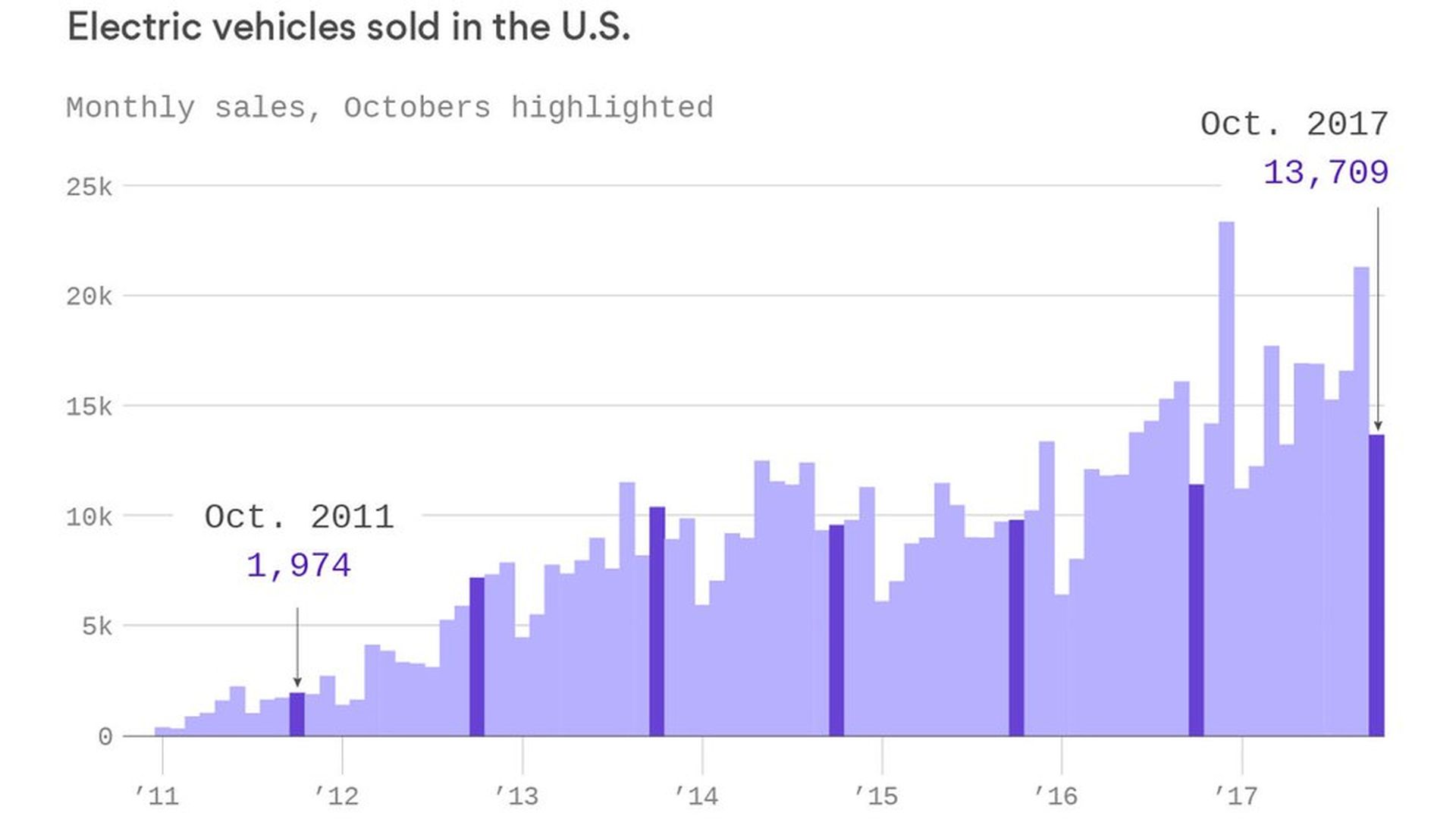 From their market snapshot: "Demand for EVs has continued to rise in 2017, setting new records for purchases and vehicle model availability. Although six models currently account for nearly two-thirds of sales, consumers have a fuller range of choices with 37 models available, thanks to marked declines in battery technology costs and enhanced range."