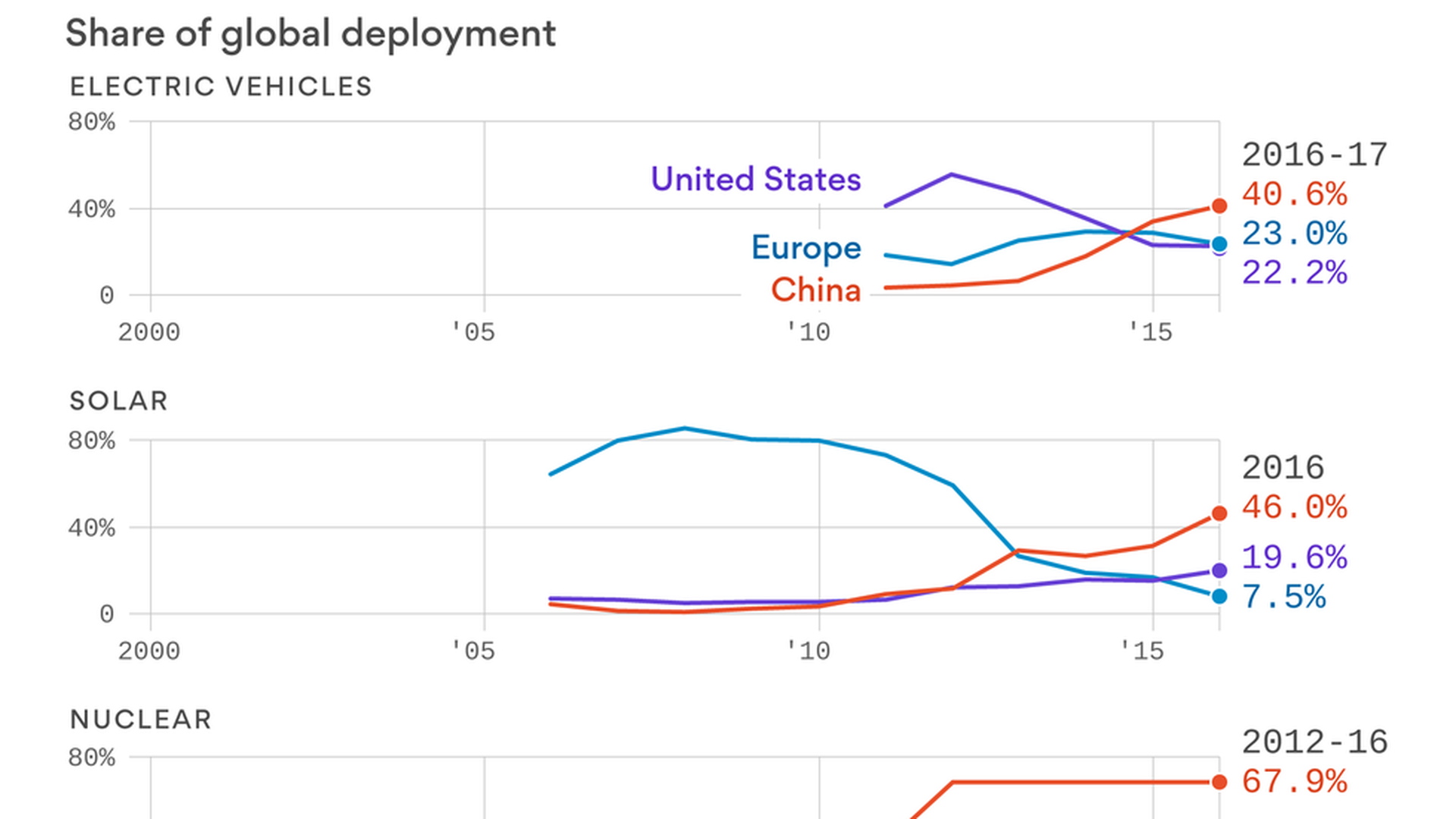 U.S. politicians have been warning for years that America couldn't let China win the clean energy race. That's exactly what has happened, with the trends most stark in electric cars, solar and nuclear energy.