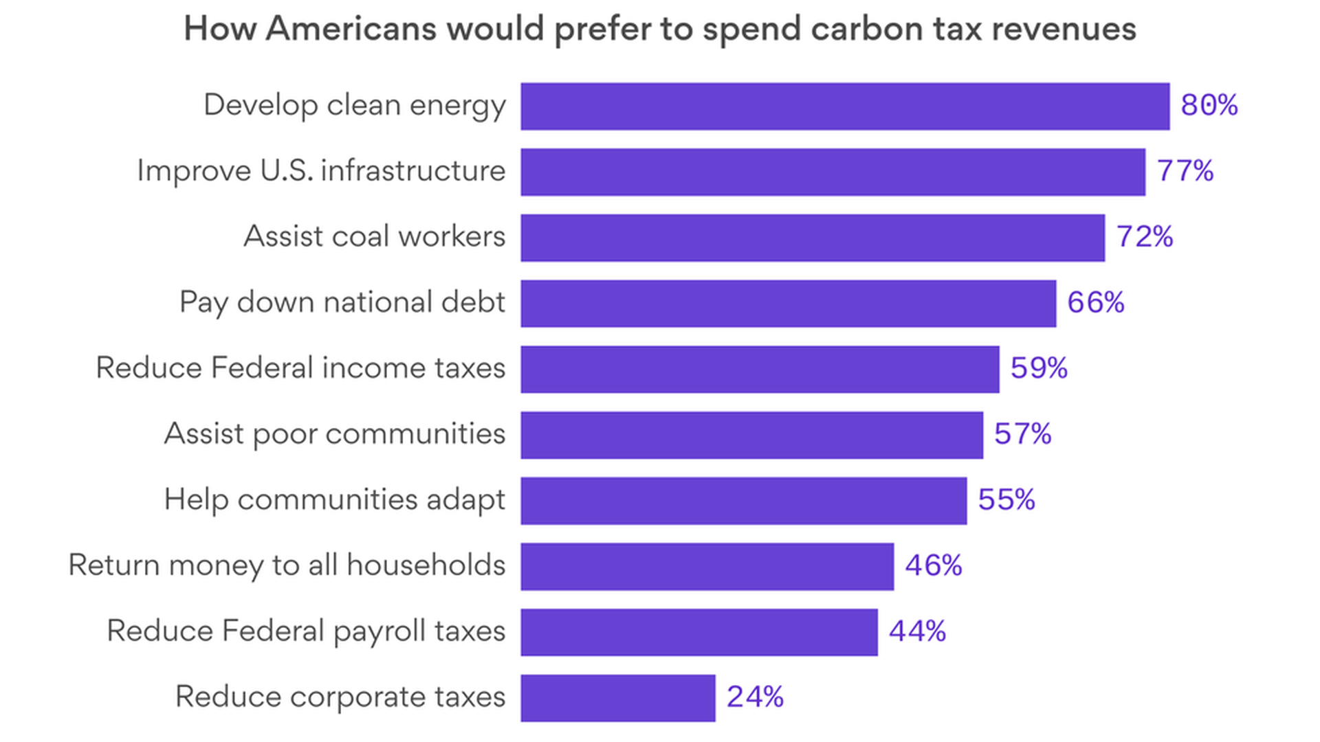 Yes, but: A number of advocates — including the Climate Leadership Council that's backed by several GOP elder statesmen and big companies — say proceeds from a tax should be returned to the public via dividends or reductions in other taxes. But the new poll shows more support for other uses of the money.