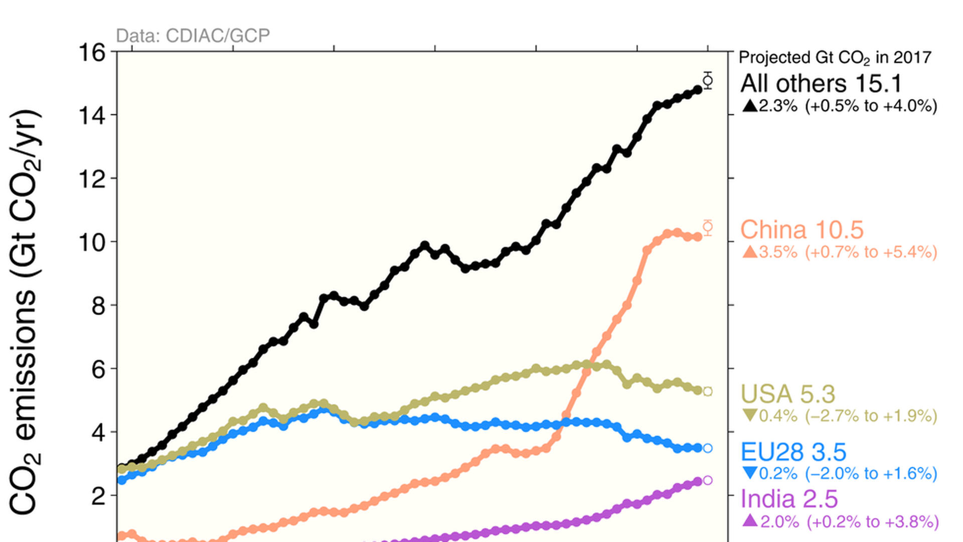 Why it matters: The report compiled by multiple scientists via the Global Carbon Project underscores how the world is not on track to achieve the level of emissions cuts needed in future years to prevent highly dangerous levels of warming.