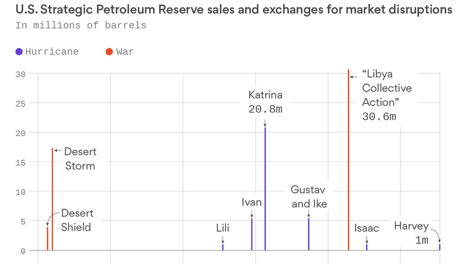 The details: The Energy Department on Wednesday said it was releasing a million barrels of oil out of the SPR that holds 670 million barrels. By comparison, the U.S. uses about 20 million barrels of oil a day, per Reuters.