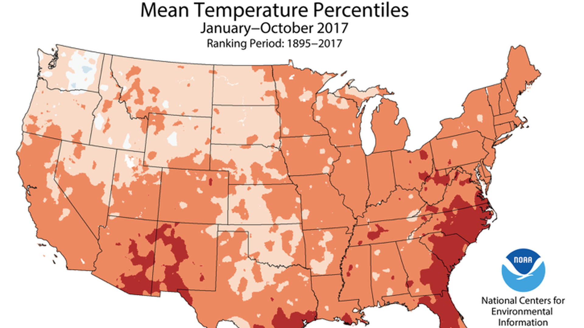 New data: "Every state across the contiguous U.S. had an above-average temperature for the first 10 months of the year," reports the National Oceanic and Atmospheric Administration in their latest snapshot of U.S. climate conditions.