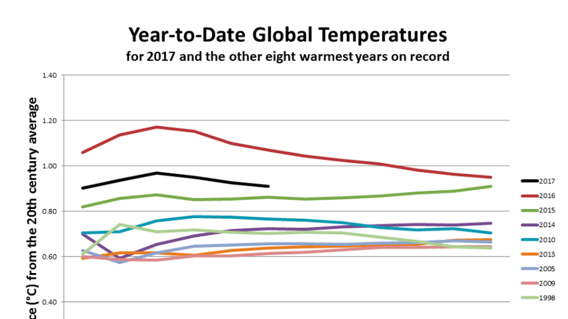 - So far, the average global temperature this year is 1.64°F above the 20th-century average of 56.3°F, according to the federal statistics.