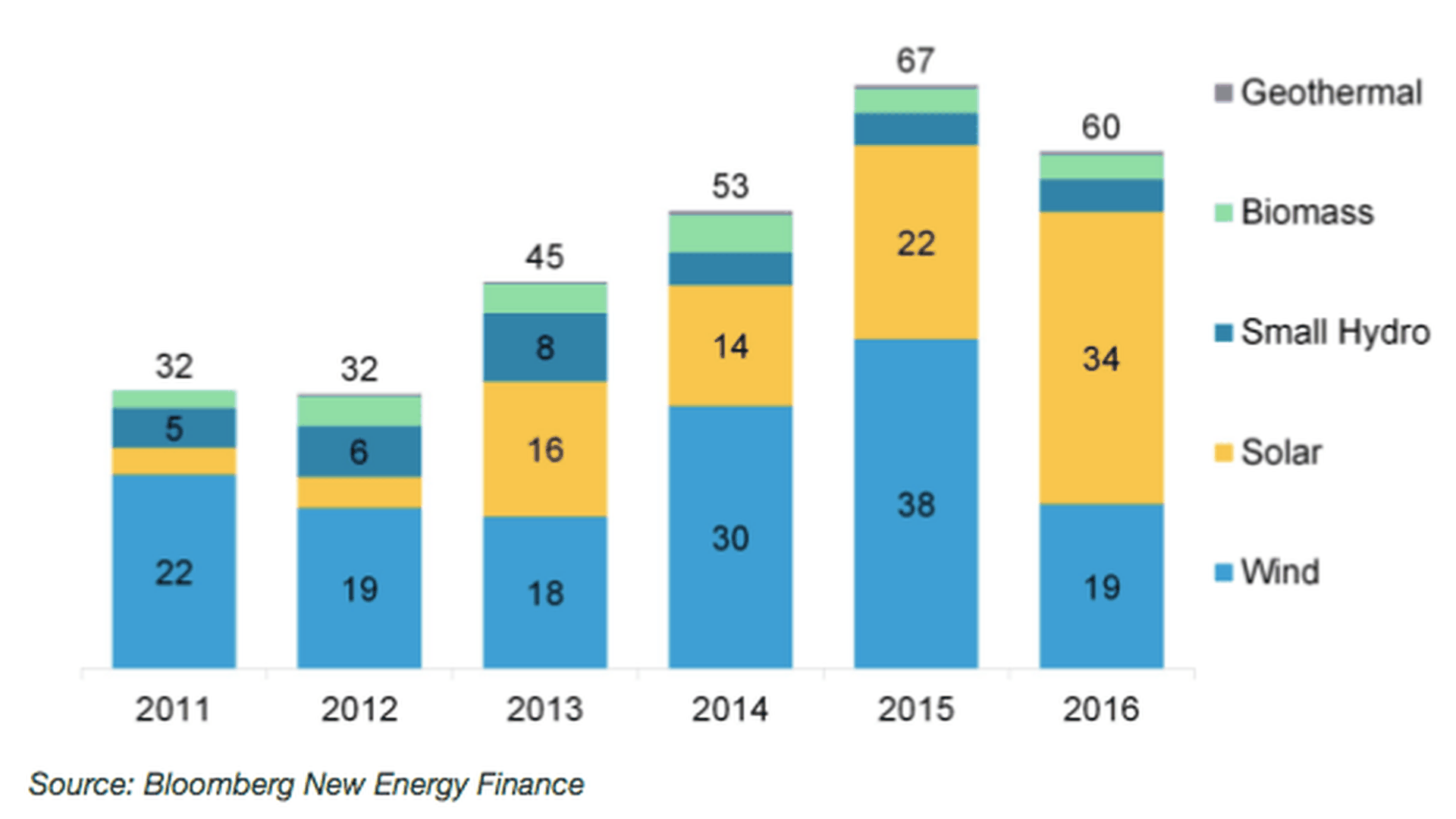 - Yes, but: BNEF said their wider country-by-country analysis of market and policy conditions reveals several "troubling" signs, including an overall $40 billion drop in clean energy investment in non-OECD nations last year.