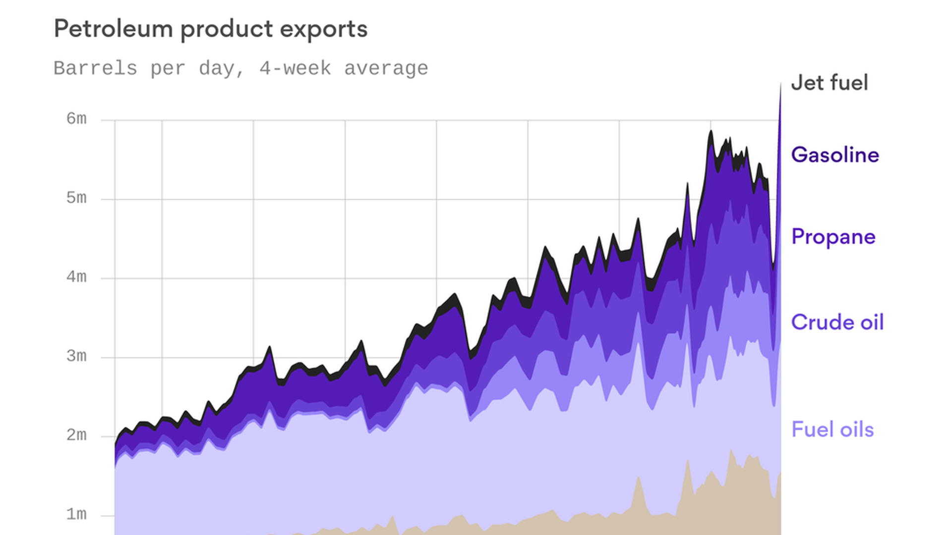 Why it matters: The data signals how the U.S. has become a major player in global petroleum markets. The expansion of crude oil exports is especially noteworthy — the lifting of the crude export ban in late 2015 combined with the shale oil surge has enabled a major rise in U.S. crude shipments.