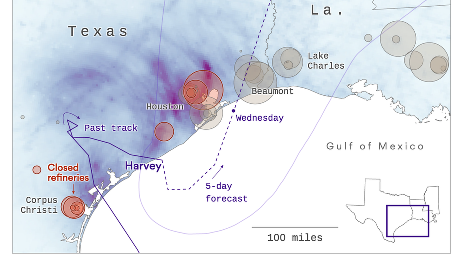 - Check out the chart above to see where refineries are closed amid massive rainfall and facilities that are in the path of Harvey.