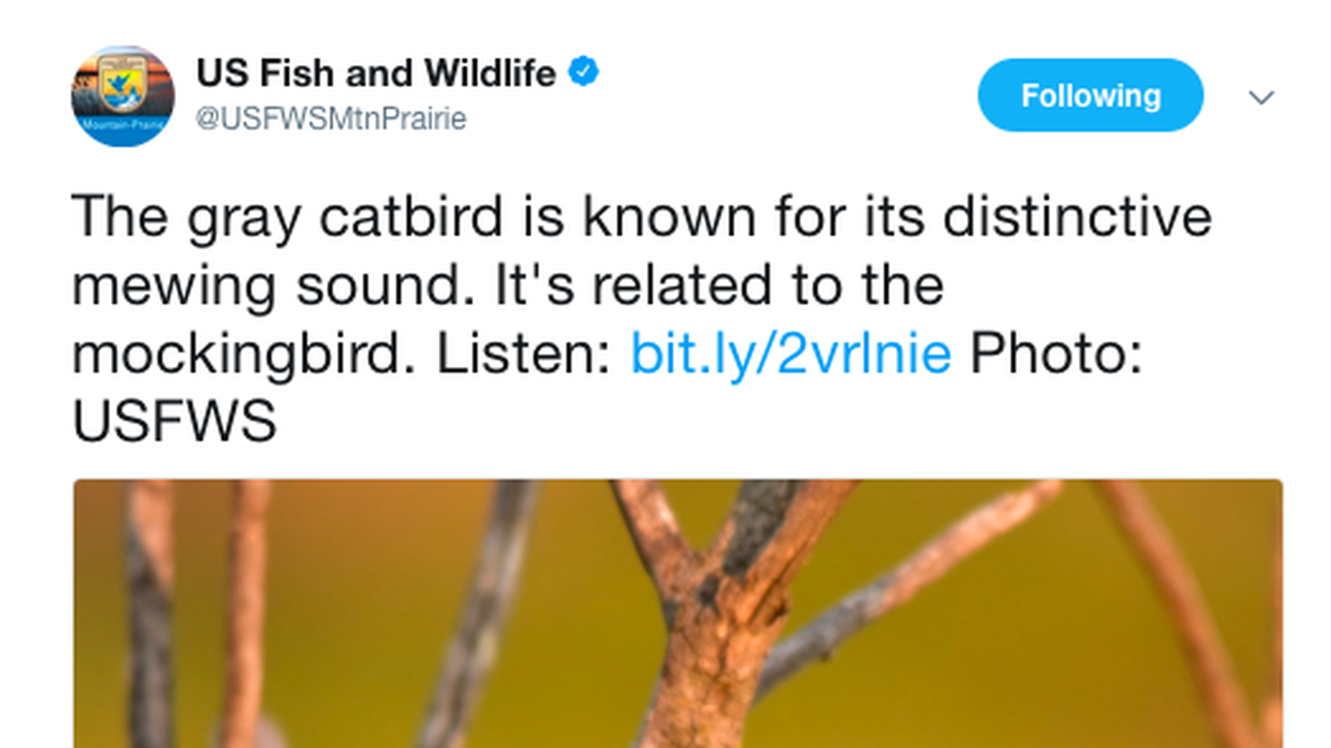 They have archived the songs of various kinds of birds (and provide all kinds of other info too). Find your favorite bird and have a listen here. And yes, the gray catbird's "raspy mew" really is kind of catlike. But they carry some prettier tunes too.