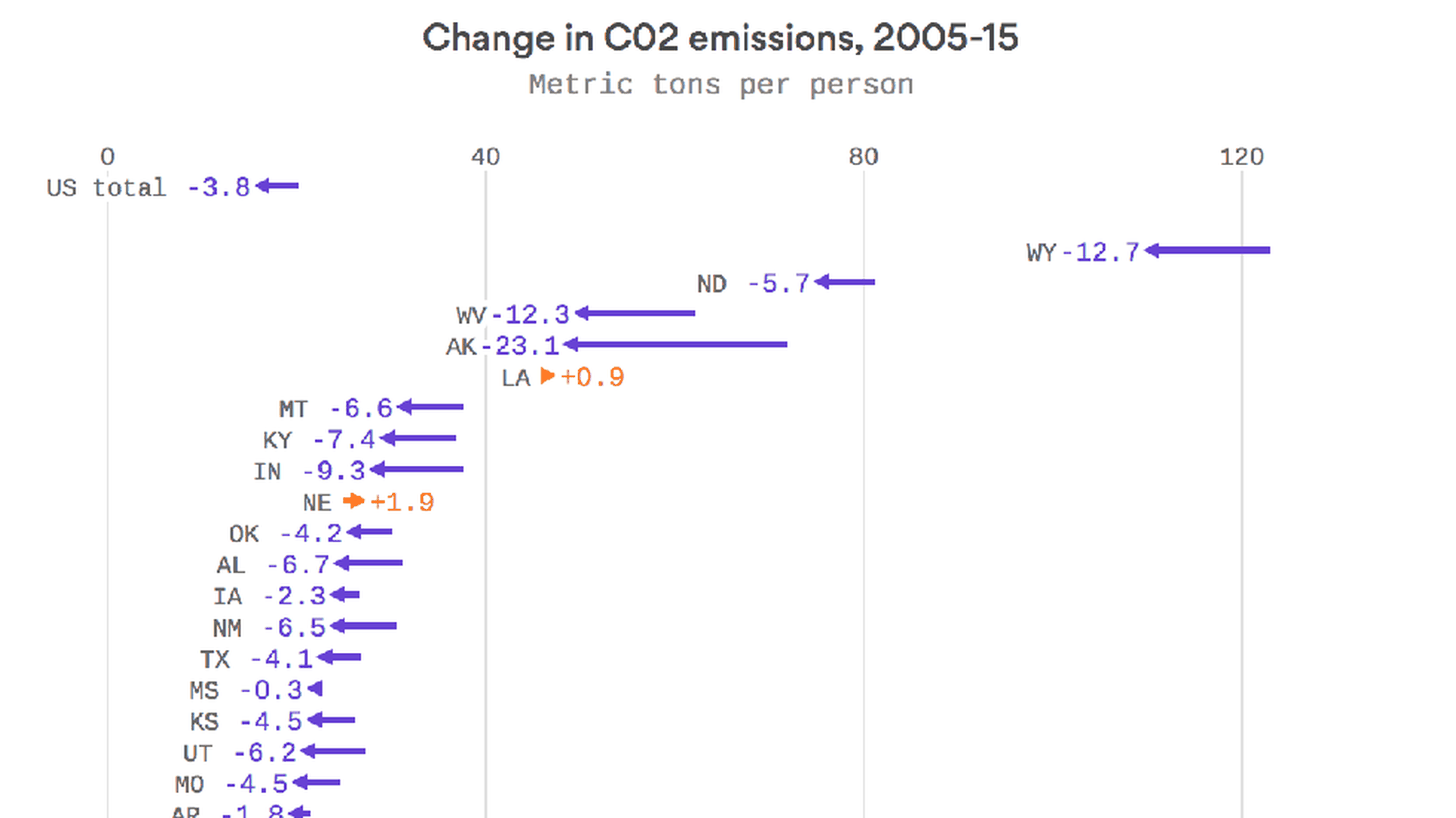 A new Energy Information Administration report provides a state-by-state breakdown of U.S. carbon dioxide emissions and their movement over a decade. The chart above tracks those changes for the 20 largest per-capita emitting states – showing a downward trend overall in CO2 emissions.