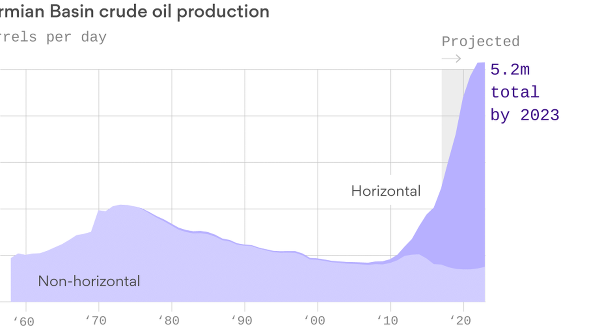 - Check out the chart above: It shows how the marriage of fracking and horizontal drilling enabled production to keep climbing, even during the price doldrums of 2014–2015. They see the Permian's boom helping to push total U.S. production to 10.5 million barrels per day this year, well past the prior record.