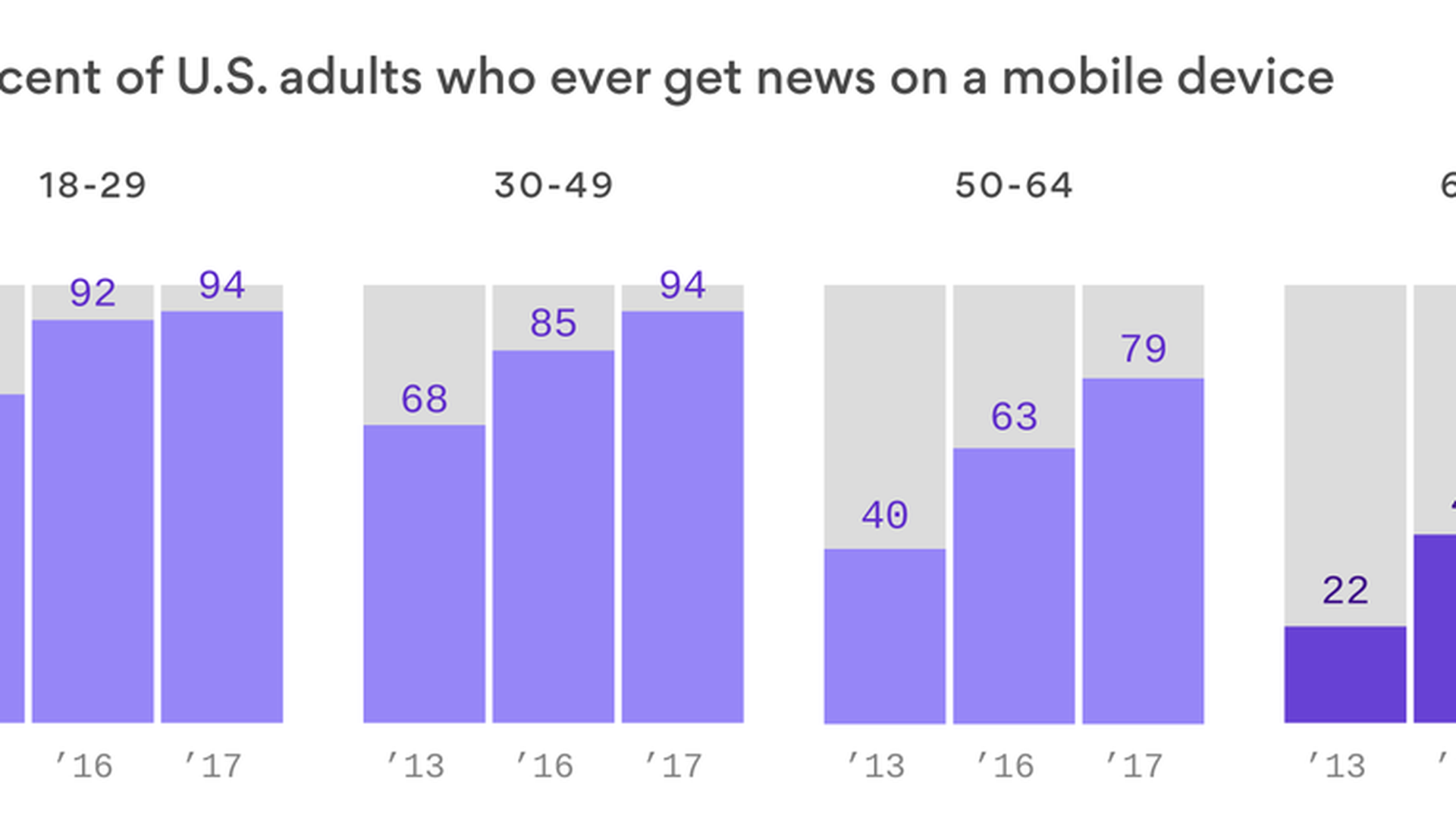 More than 80% of U.S. adults get news on their phones — up from roughly half of Americans just four years ago, according to a new survey from Pew Research Center. Most of that growth comes from adults older than 65 whose news consumption via mobile spiked almost 25% in the last year, and has tripled over the past four years. The next oldest group of adults shows a similar pattern, Sara reports.