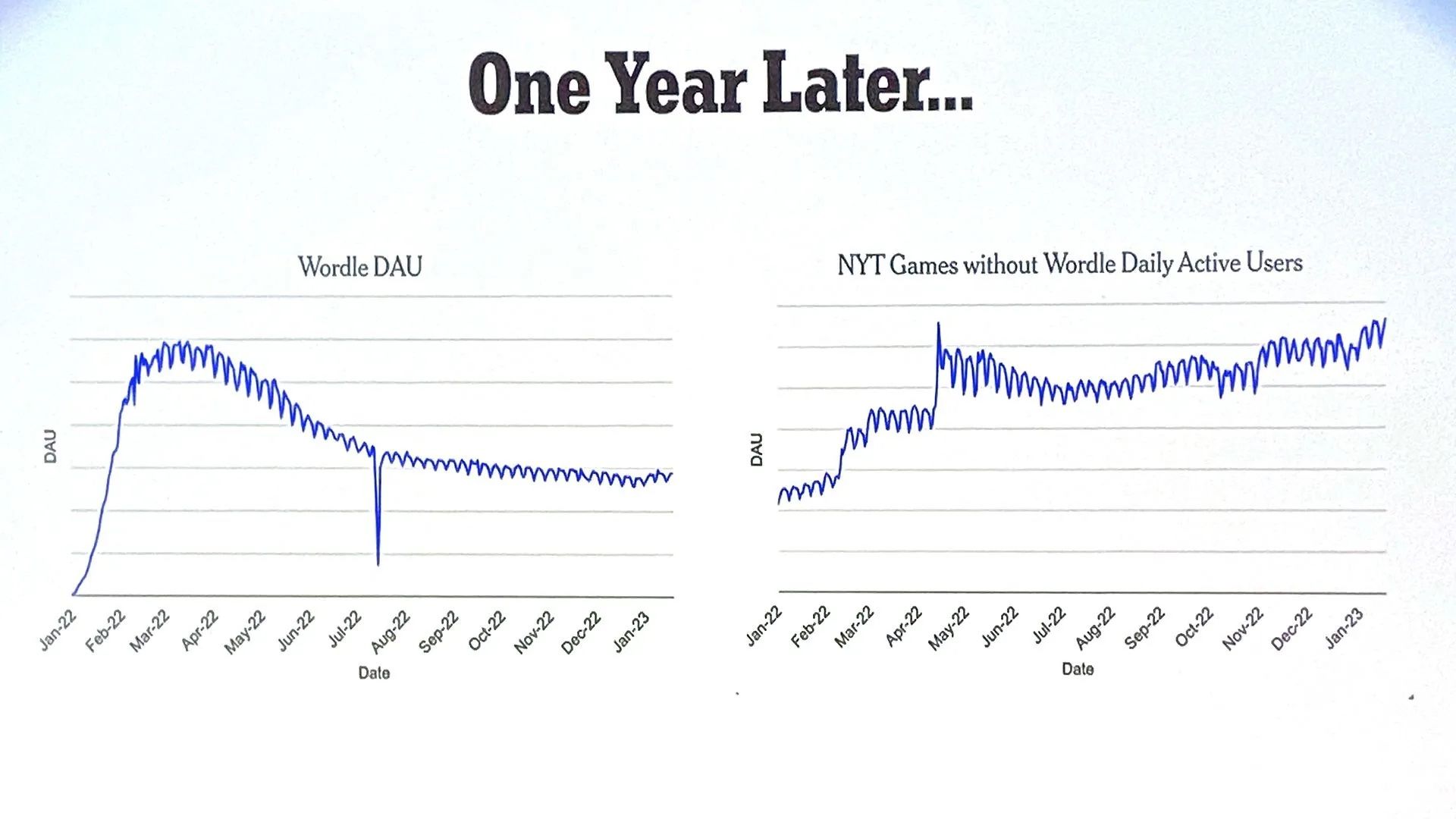 The New York Times' data on Wordle usage (including a brief July outage). Photo: Axios
