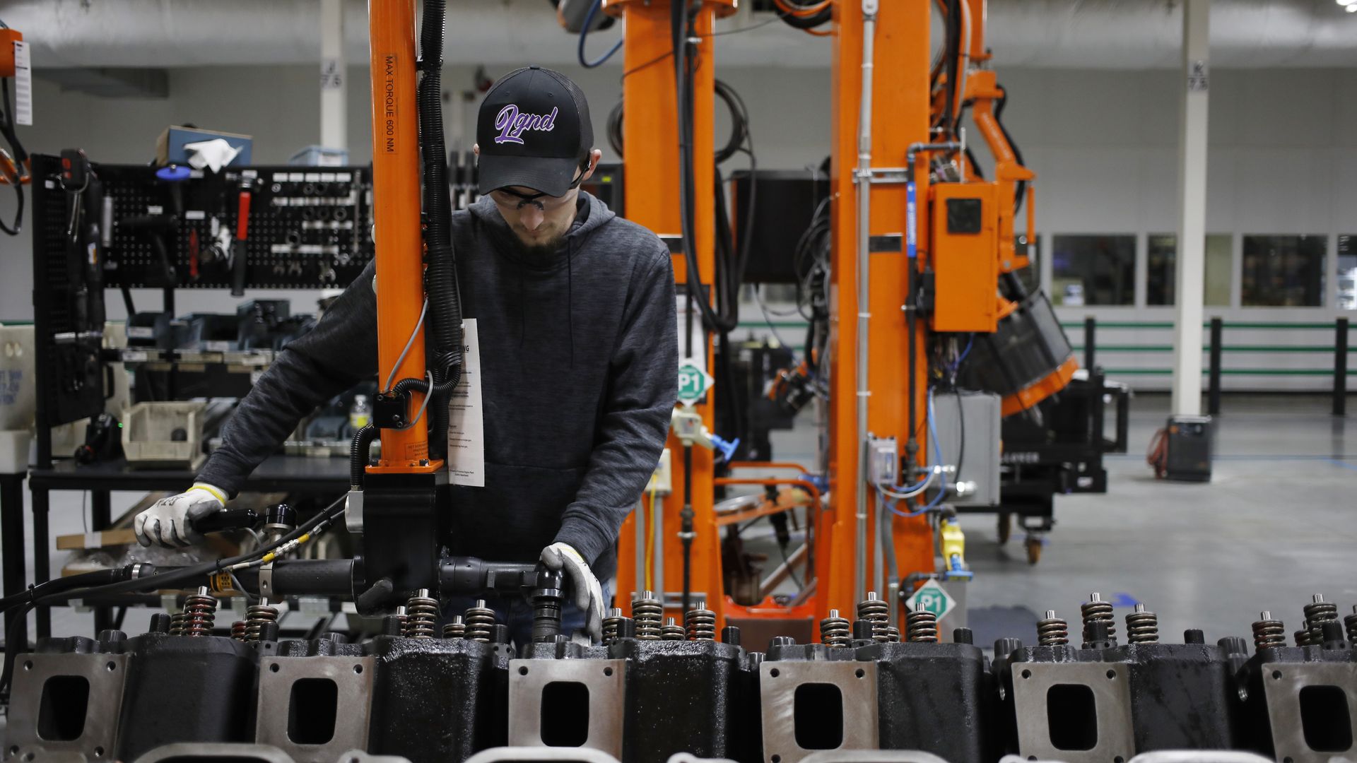 A worker uses machinery to assemble components at the Cummins Seymour Engine Plant in Seymour, Indiana. Photo: Luke Sharrett/Bloomberg via Getty Images