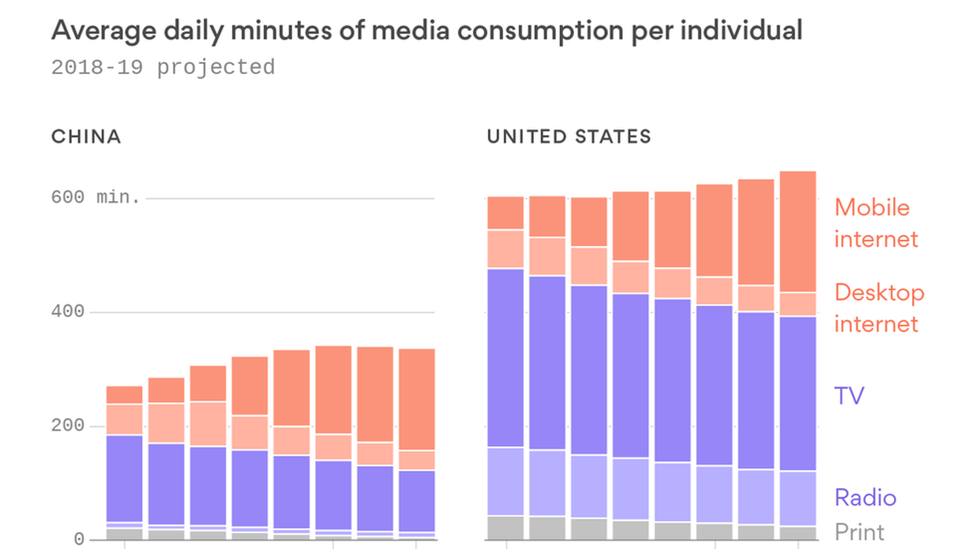 - The average person in the U.S. spends 649.5 minutes daily on media, while the average person in China spends 337.5 minutes, per ZenithOptimedia's latest global consumption report.