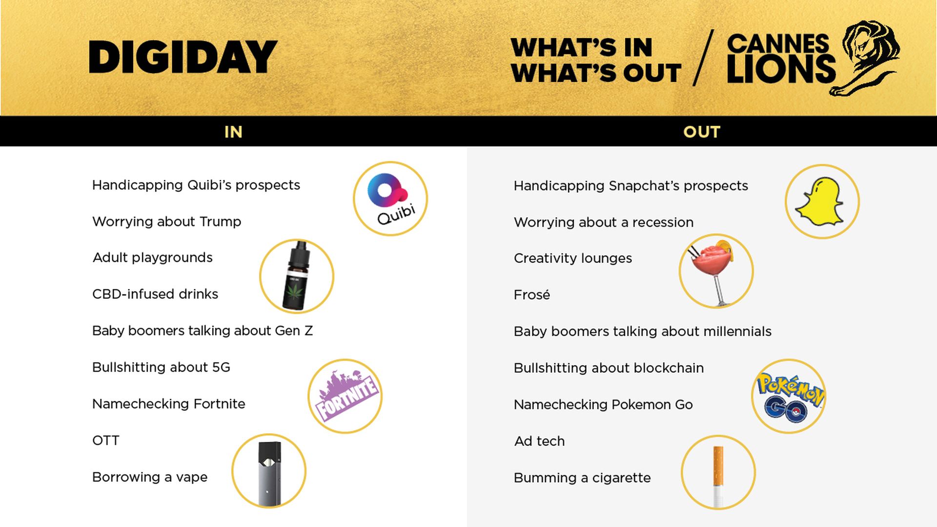 - It also serves as an opportunity for marketers to observe and/or embrace new trends. Digiday's annual list of what's "in" and "out" at Cannes is a fun overview of what's being discussed and experienced on the ground here in France.
