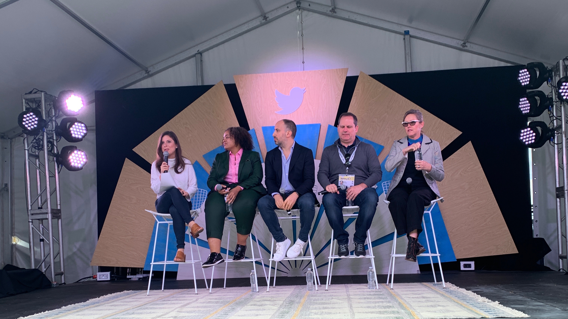 SXSW panel (from l to r): Axios' Sara Fischer, BuzzFeed's Shani Hilton, US News Partnerships at Twitter's Nick Sallon, Dunkin's Tony Weisman, and CNN Digital's Christine Cook. Photo: Rachel Racoosin/Axios