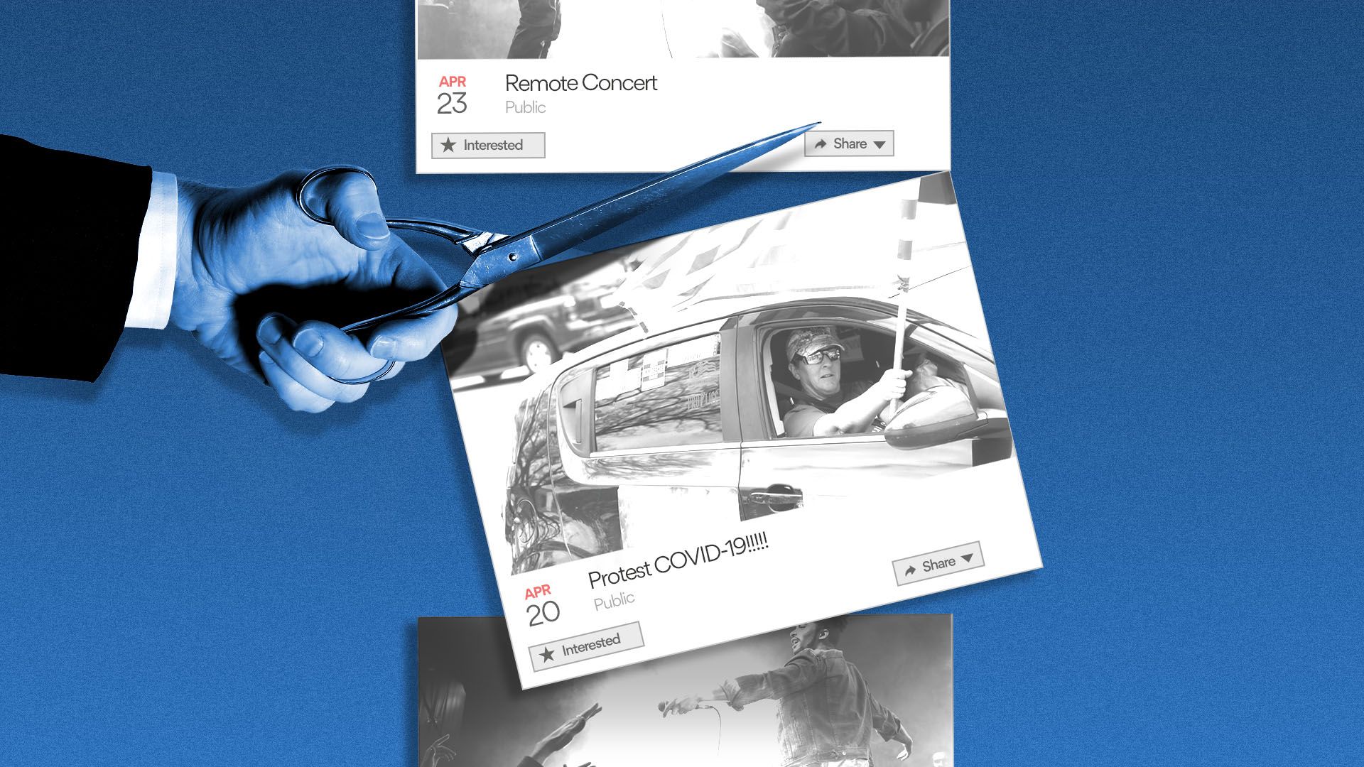 Facebook's decision to take down some events organized by protesters against state and local pandemic measures is putting conflicts between public health and free speech into stark relief, Axios' Scott Rosenberg writes.