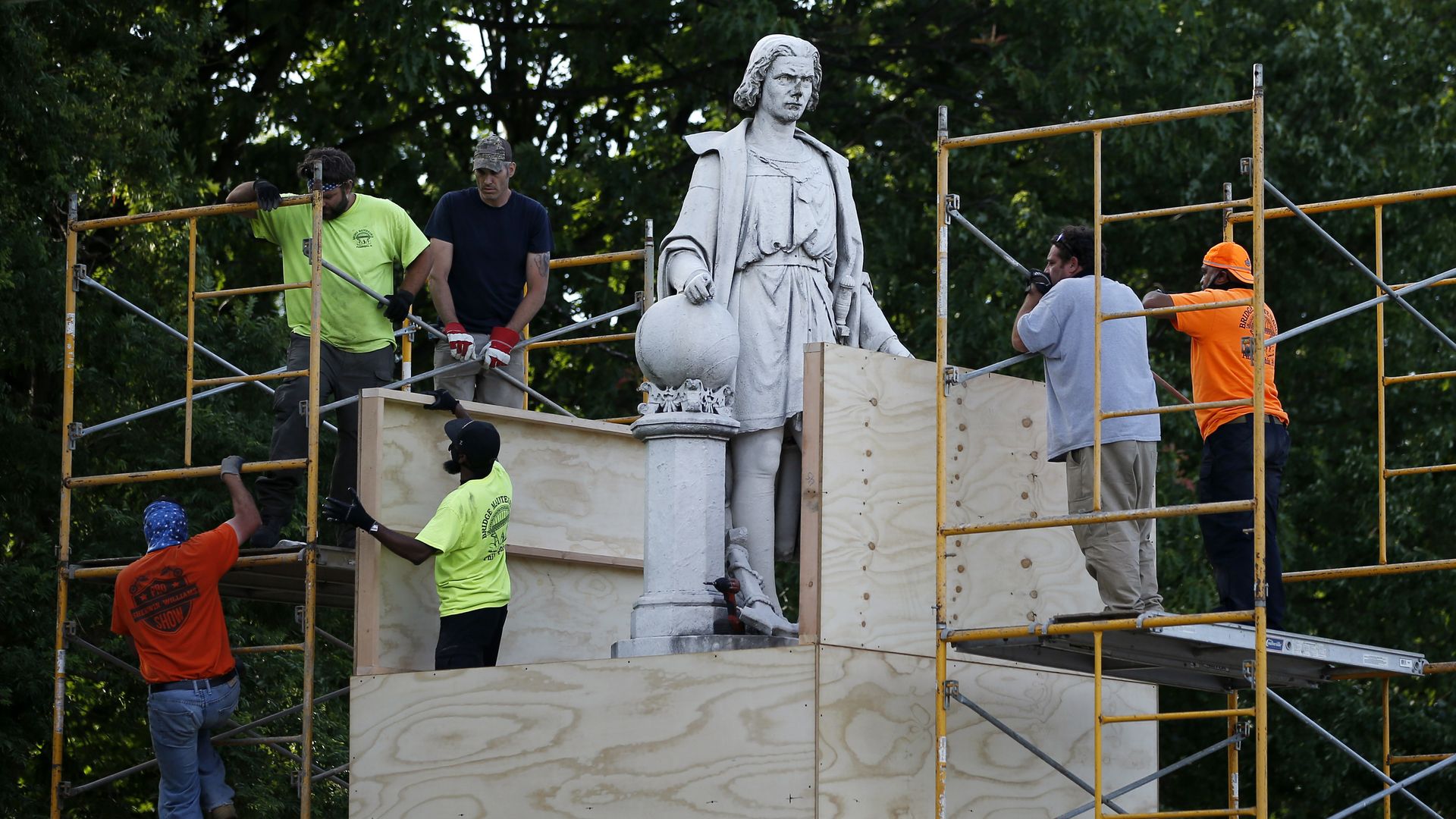 The Columbus statue in South Philly gets boxed up in June 2020. Photo: Matt Slocum/AP