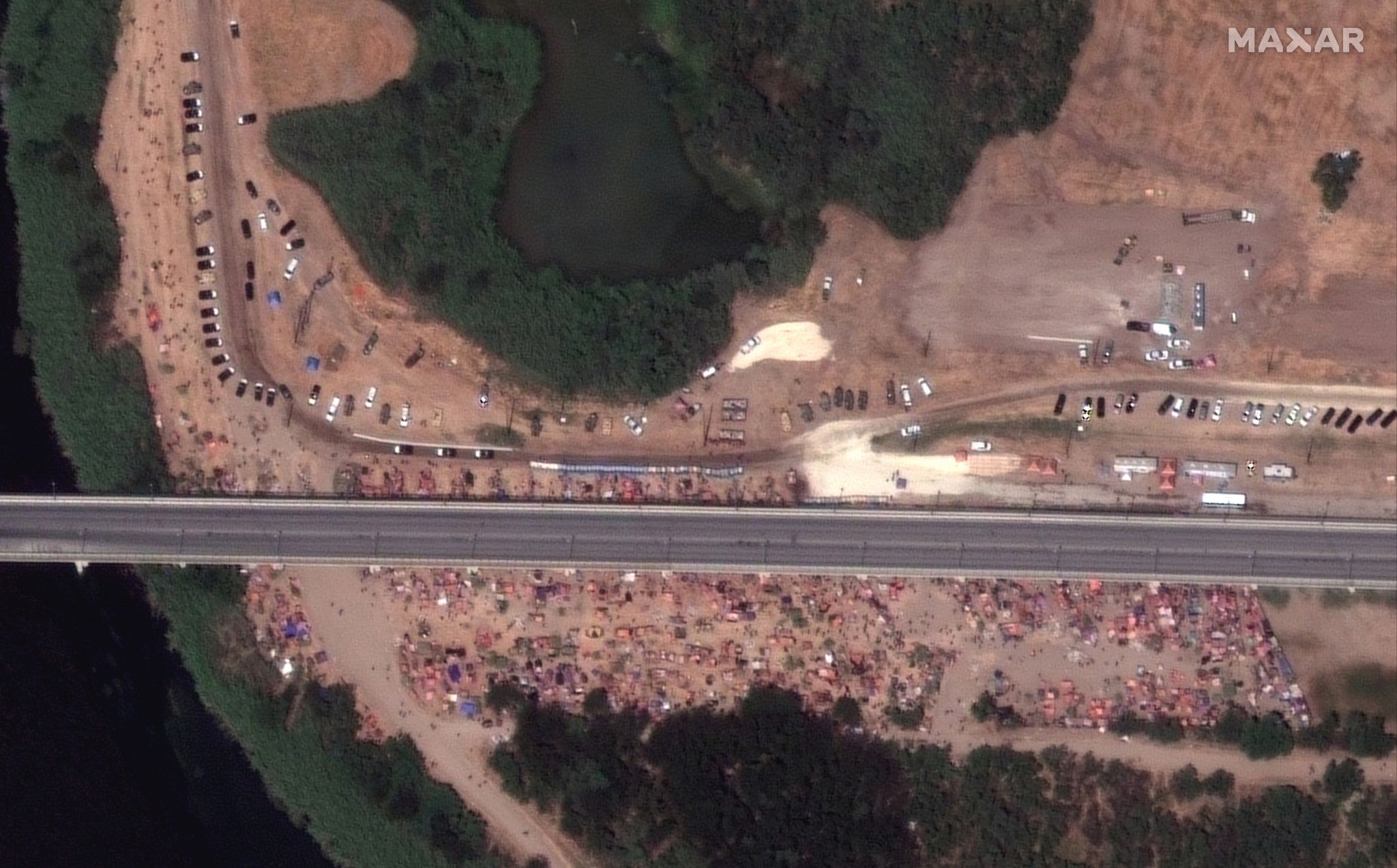 Above: A drone's-eye view of the International Bridge near Del Rio, where thousands of migrants are waiting to be processed.