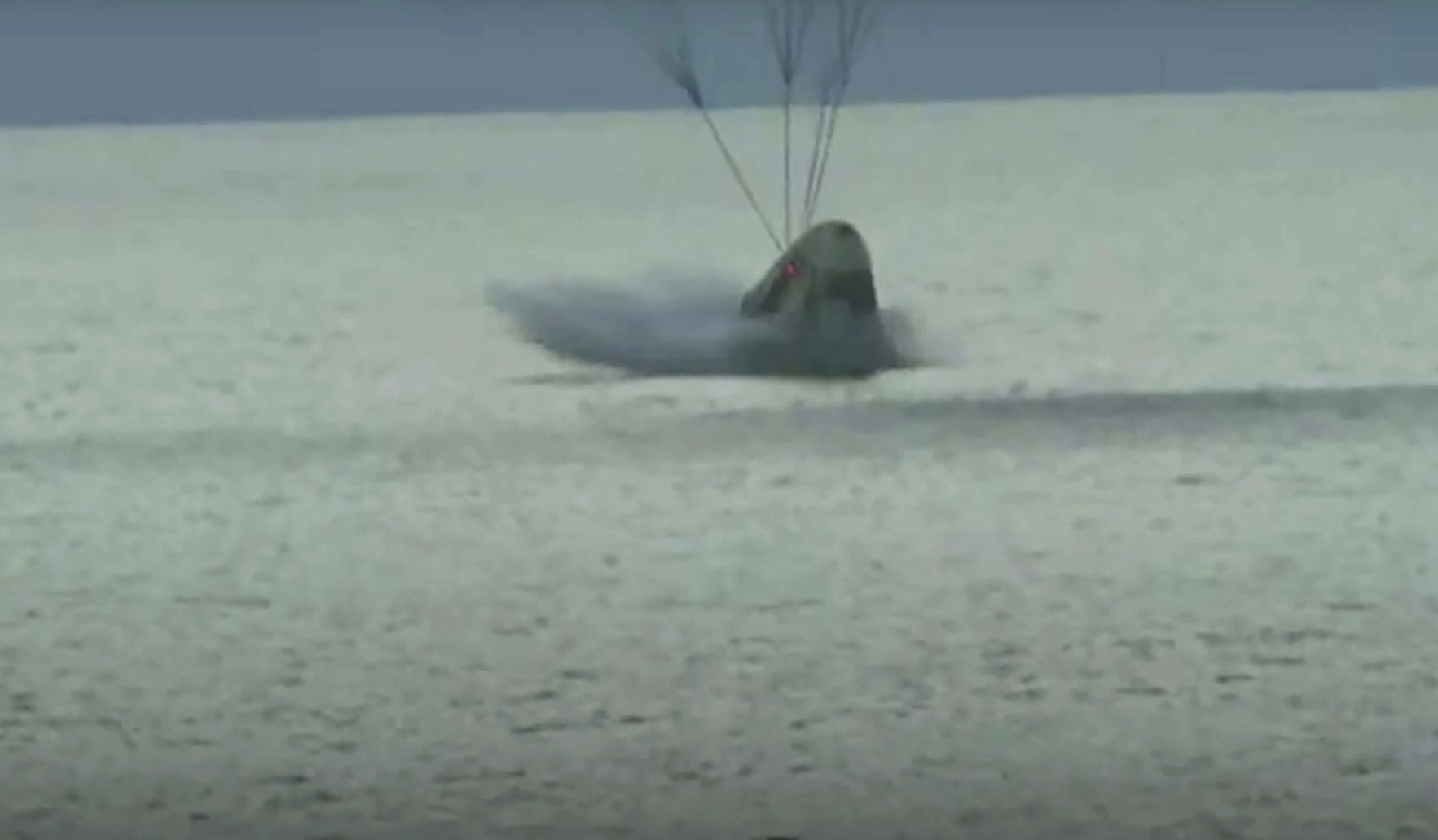 This split screen shows the crew as their capsule parachutes into the ocean.