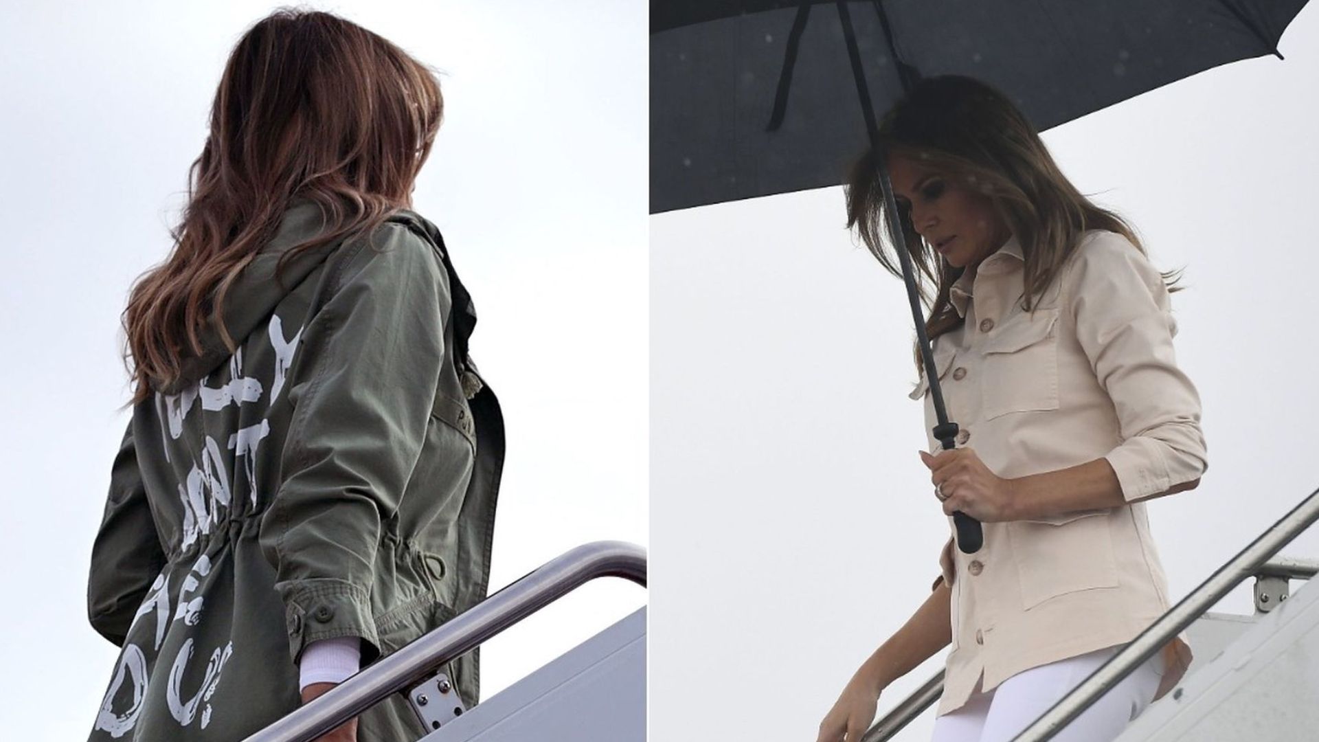 Melania Trump did a surprise visit to meet with border children today. Her jacket attracted notice. L: Trump boarding the plane to Texas. Photo: Chip Somodevilla/Getty Images. R: Melania de-planing in Texas. Photo: Manel Ngan/AFP/Getty Images