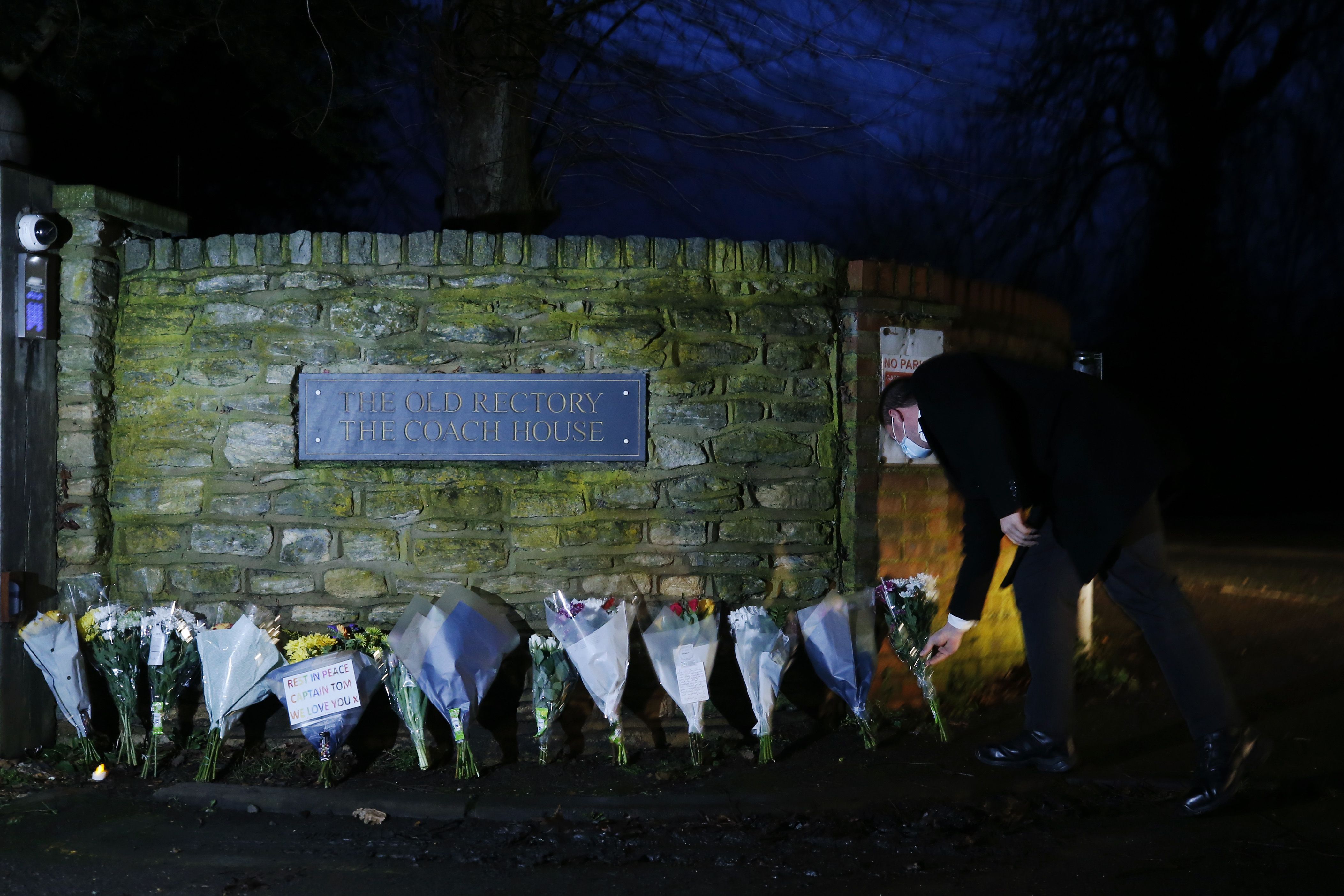 Above: Flowers outside the residence of Capt. Tom Moore, who died today in England after being hospitalized this weekend. He tested positive for COVID-19 and was receiving treatment for pneumonia.