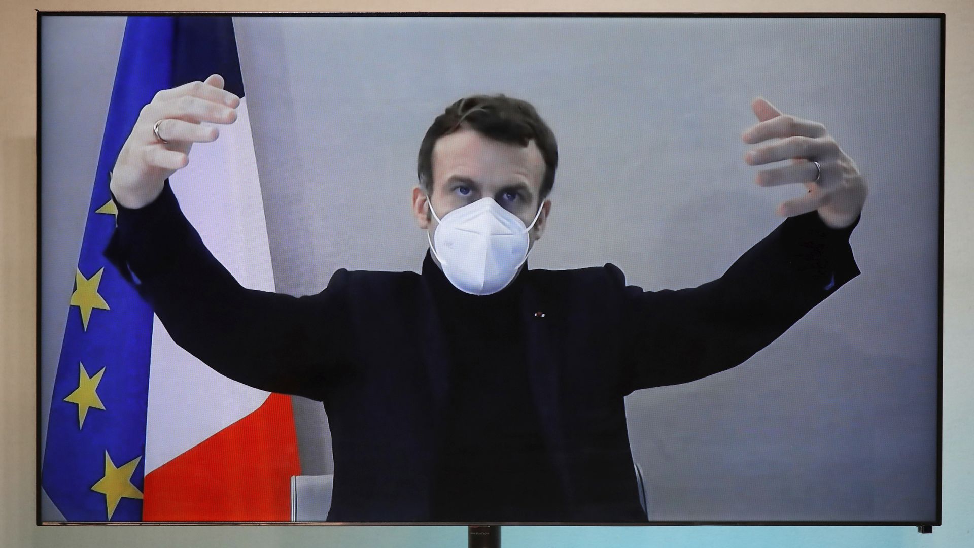 French President Emmanuel Macron virtually attends a round table for the National Humanitarian Conference in Paris. Photo: Charles Platiau/Pool via AP