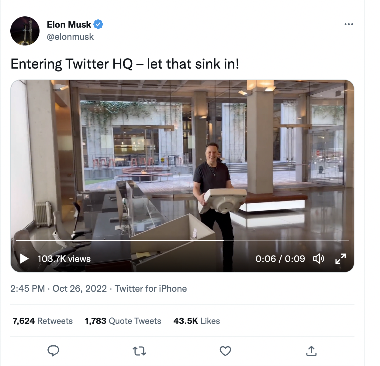 Self-described "Chief Twit" Elon Musk strolled into Twitter HQ today with a sink in hand, ahead of the expected close of his deal on Friday.