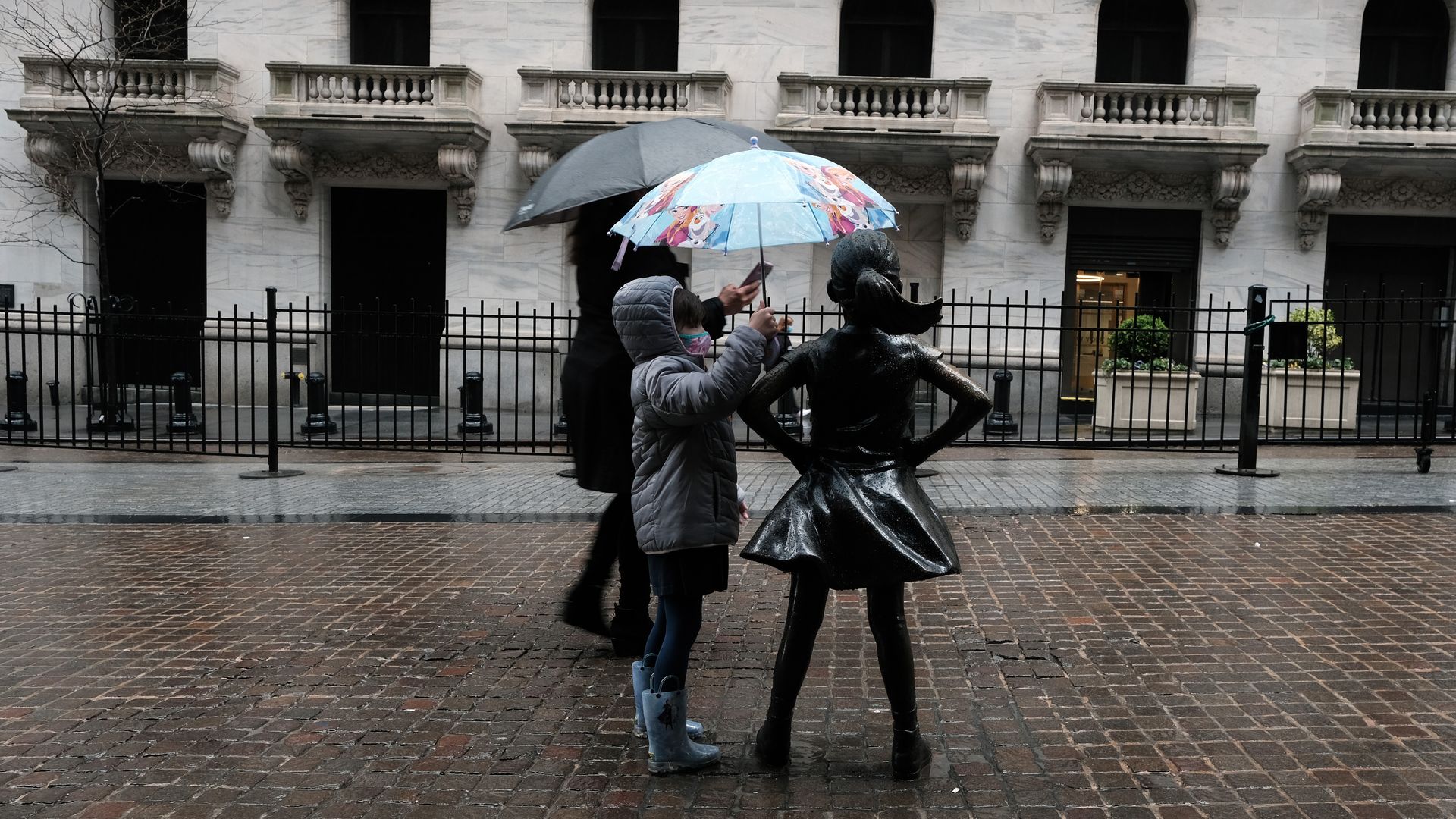 A little girl holds an umbrella over Fearless Girl by the New York Stock Exchange in April. Photo: Spencer Platt/Getty Images