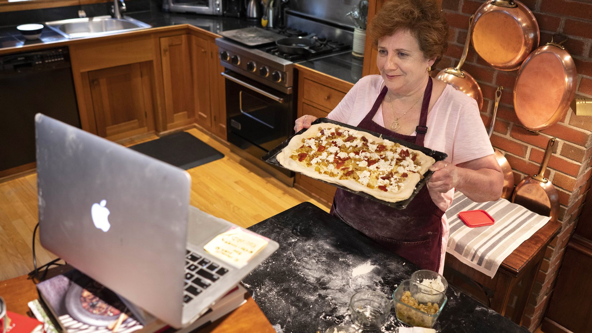 Jill Strauss of Jillyanna's Woodfired Cooking School in Kennebunkport, Maine, whips up an eggplant parmesan pan pizza during a Zoom class. Photo: Gregory Rec/Portland Press Herald via Getty Images