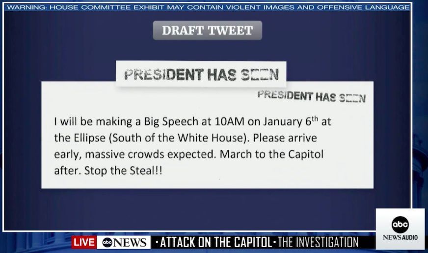 Why it matters: The House Jan. 6 committee used this draft to allege at today's hearing that Trump was planning well in advance to urge the crowd to march on the Capitol, Axios' Erin Doherty reports.