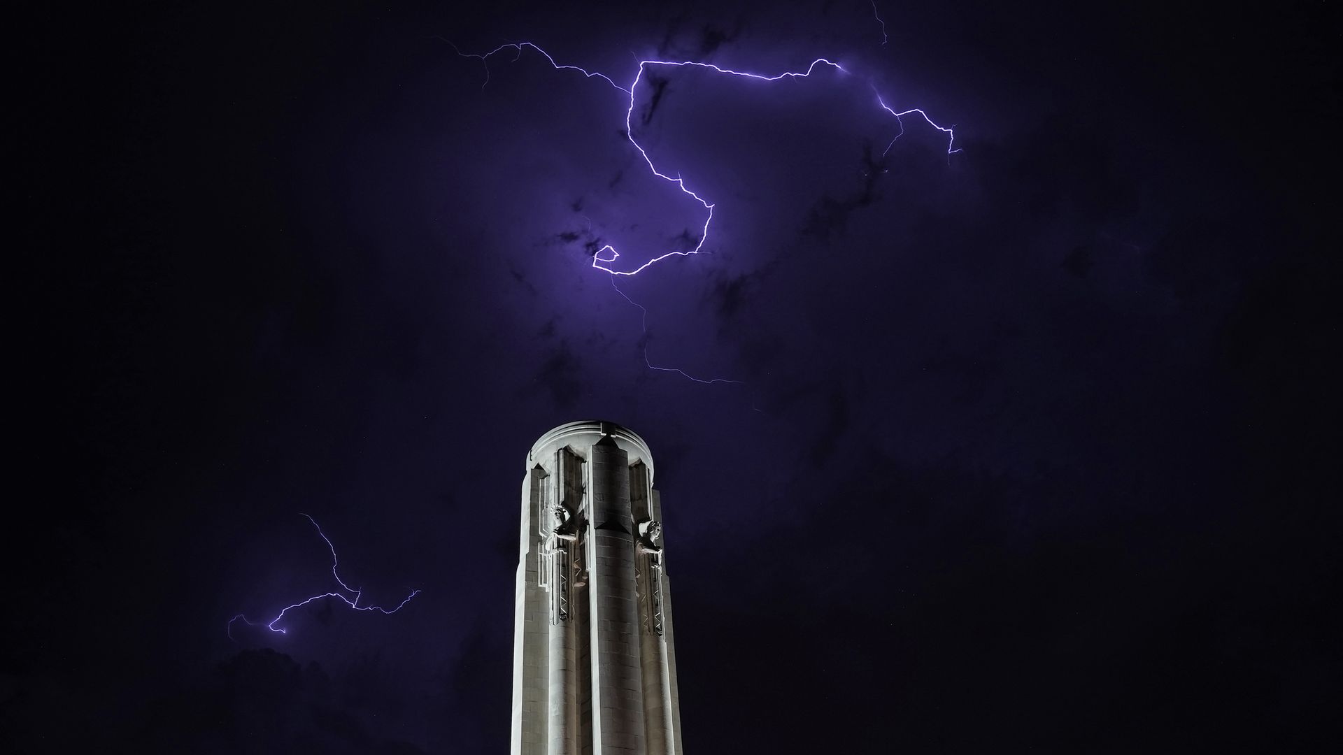 Lightning flashes over the Liberty Memorial Tower in Kansas City, Mo., on Saturday. Photo: Charlie Riedel/AP