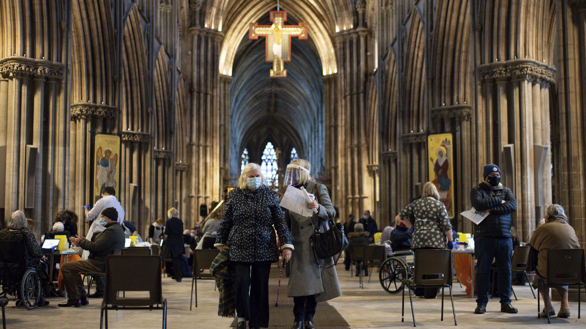 Members of the public receive the Oxford/AstraZeneca coronavirus vaccine at Lichfield Cathedral, in Staffordshire, England. Photo: Jacob King/PA via AP