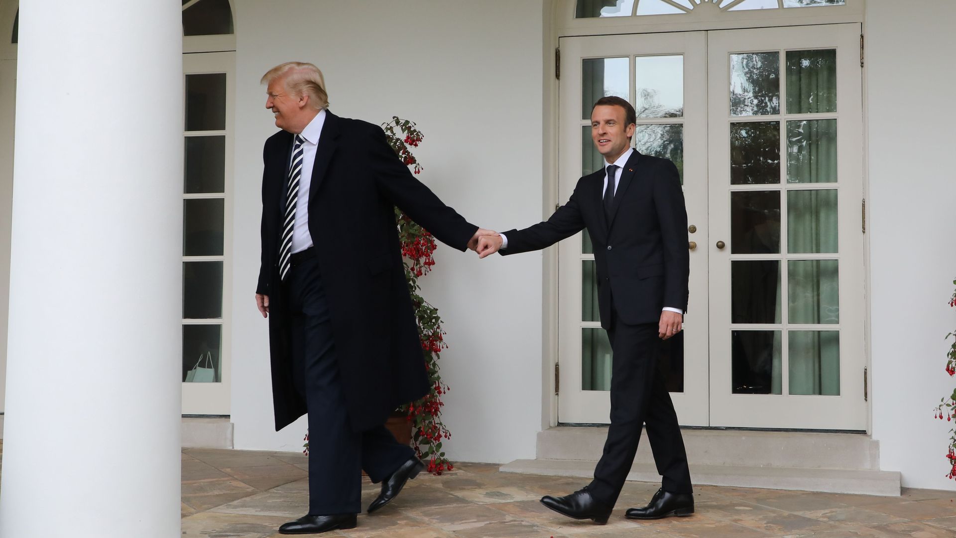 The handshake: French President Emmanuel Macron and Donald Trump during a state welcome at the White House. Photo: Nicholas Kamm/AFG/Getty Images