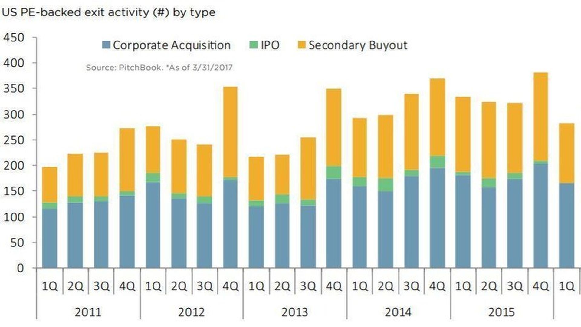 - Caveat: It can be very difficult for data providers like PitchBook to accurately gauge market-wide leverage multiples, given that so many LBO values and debt breakdowns are kept private. Thus the average is prone to being weighted toward take-private transactions, which tend to be larger (and, historically, have higher leverage multiples). It's also worth noting that PitchBook also reported a mark in excess of 6x for Q1 2016, but the overall year settled much lower.